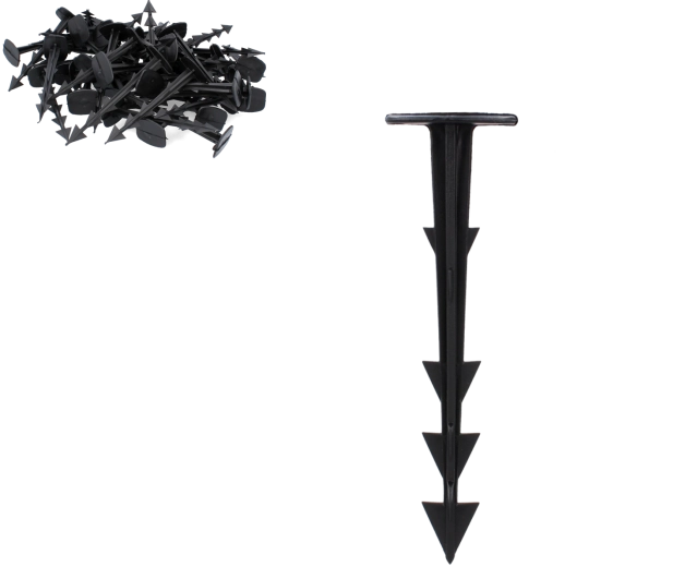 Geschikt voor gebruik met agrotextiel, geotextiel, non-woven textielen en folies bij mulchen, plantbescherming en onkruidonderdrukking. De set van 50 stuks dekt zowel kleinere als grotere oppervlakken en maakt snelle installatie eenvoudig.