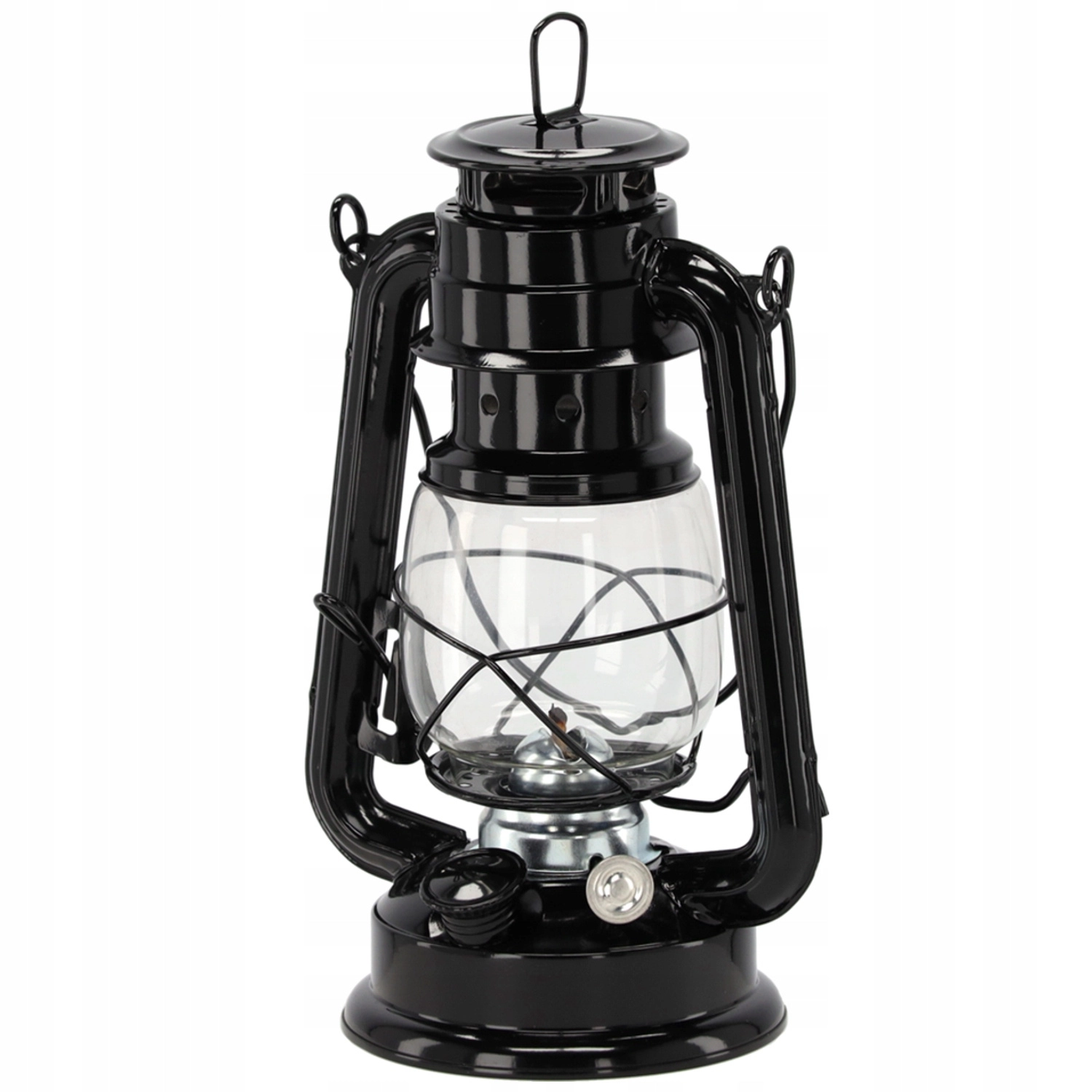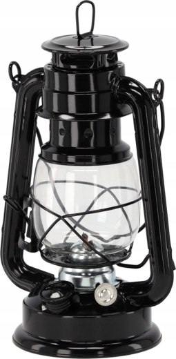 Deze metalen petroleumlamp in het zwart combineert een tijdloze vintage look met praktische eigenschappen. Dankzij de glazen cilinder en de beschermende draadkorf is de vlam beschermd, terwijl het draaiknopje vloeiende helderheidsregeling mogelijk maakt. De robuuste hendel vergemakkelijkt zowel dragen als ophangen.