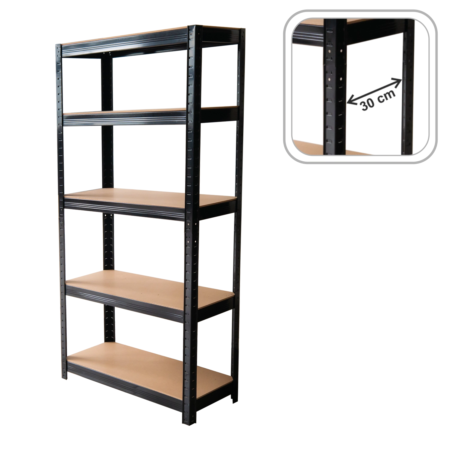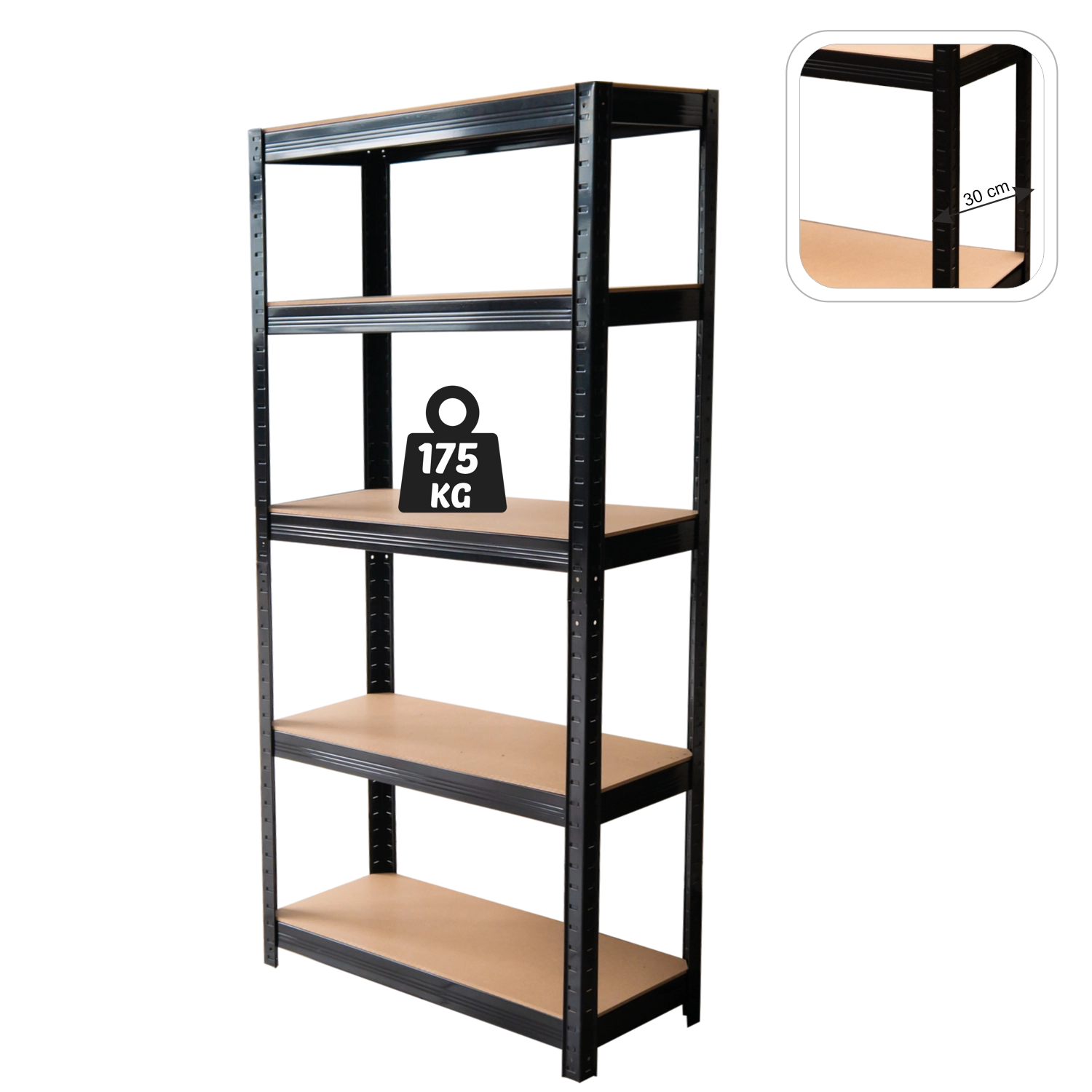 Universele vijflaagse stellingkast in het zwart voor werkplaats, garage en magazijn. De constructie van verzinkte stalen profielen en legborden van HDF-platen zorgt voor stabiliteit en een lange levensduur. Dankzij de verstevigingen onder elk legbord draagt de stelling tot 175 kg per legbord (gelijkmatig verdeeld), in totaal tot 875 kg. Eenvoudige montage zonder complex gereedschap voor een snelle ingebruikname.
