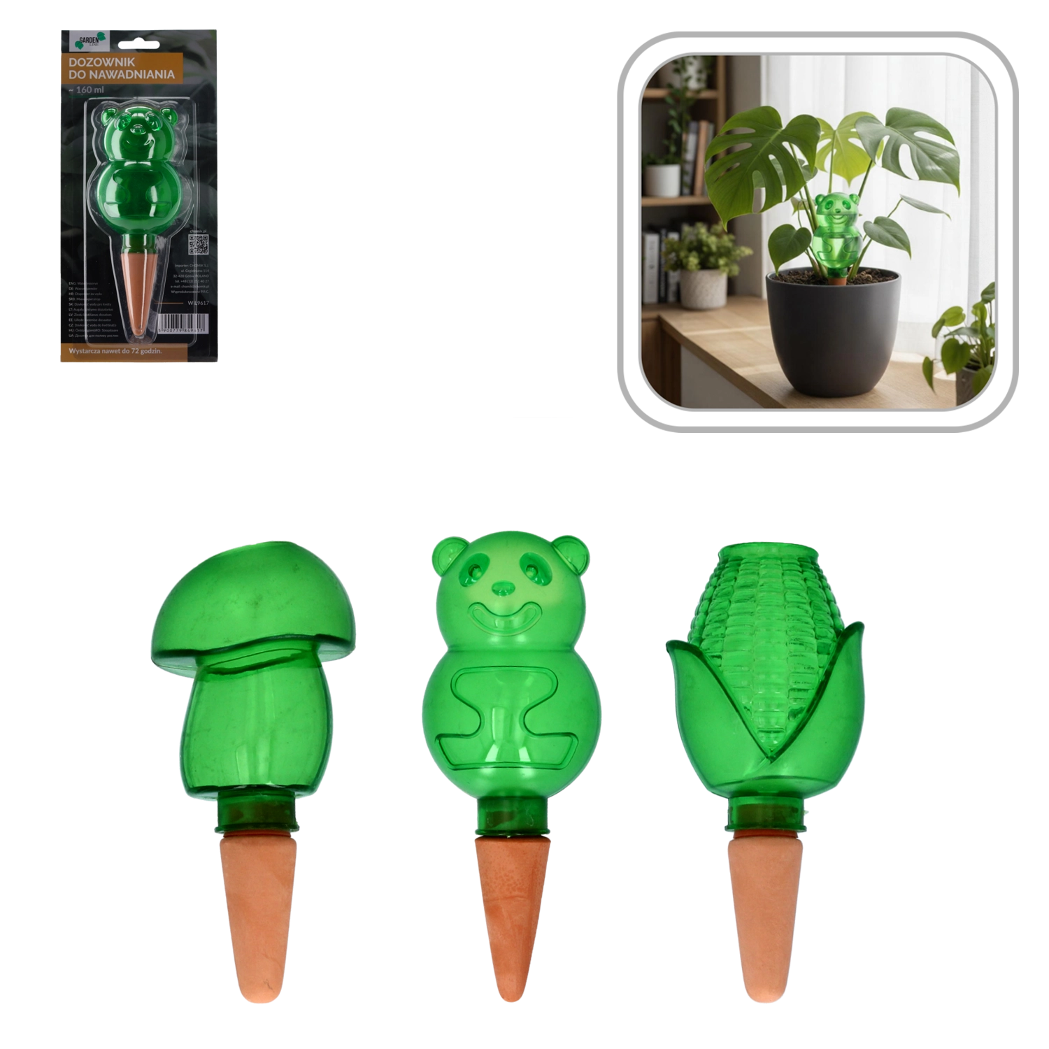 Kies de vorm van een beertje, maïskolf of paddenstoel en geef uw planten een speelse look die tegelijk de praktische functie van bewatering vervult.