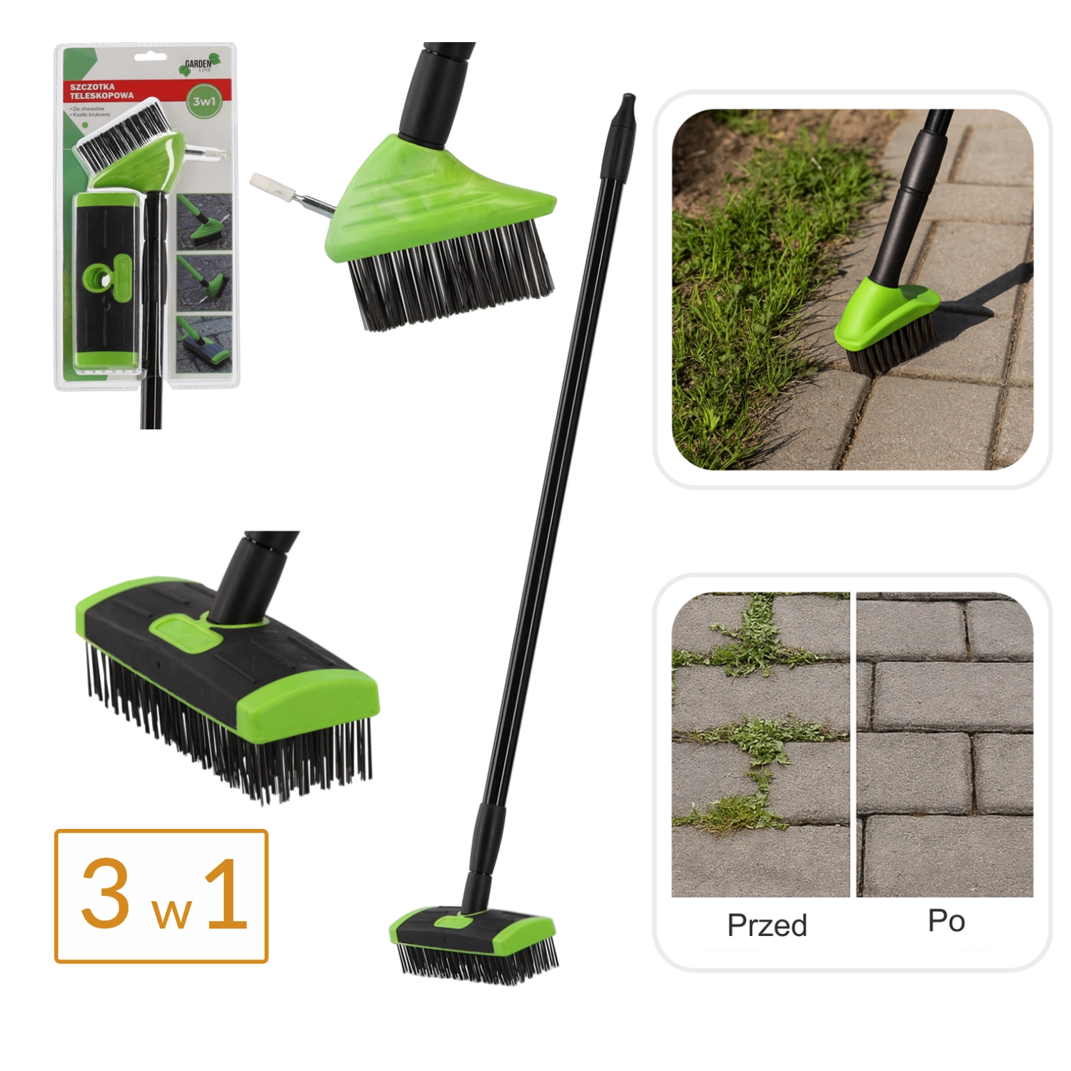 De praktische 3-in-1 set combineert drie krachtige opzetstukken voor grondige reiniging van buitenoppervlakken. De stijve draadborstelharen met messingcoating verwijderen vuil, mos en onkruid zonder chemicaliën, terwijl de lichte en sterke telescopische steel comfortabel werken in staande positie mogelijk maakt. Ideaal voor sierbestrating, stoepranden, erven en terrassen.