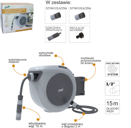 - Volledige set accessoires in de verpakking – snelkoppeling, sproeimondstuk en kraanaansluiting voor directe installatie.