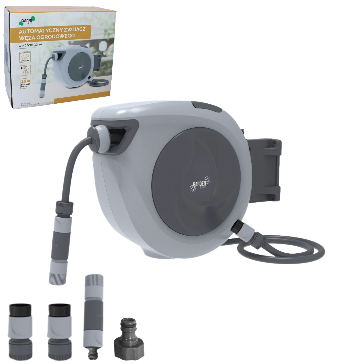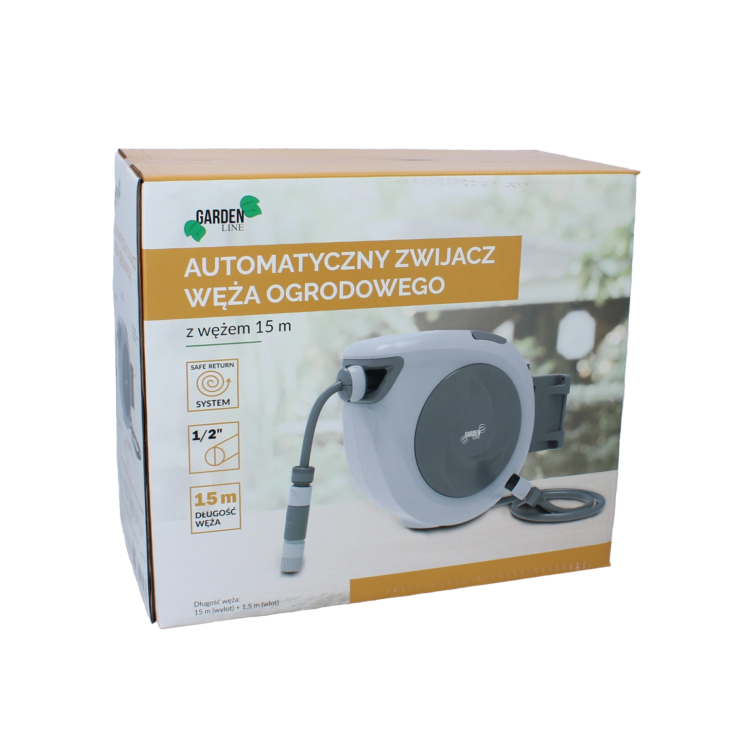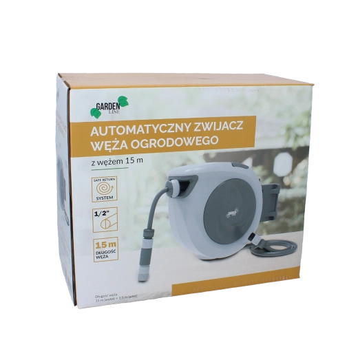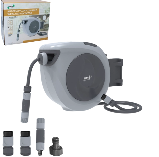 Automatische tuinslanghaspel 15 m vereenvoudigt het dagelijkse tuinonderhoud. De slang rolt soepel en veilig op, zonder rukken of knopen, terwijl de draaibare beugel een vrije reikwijdte over het hele oppervlak garandeert. De compacte behuizing bespaart ruimte en houdt de tuin netjes.