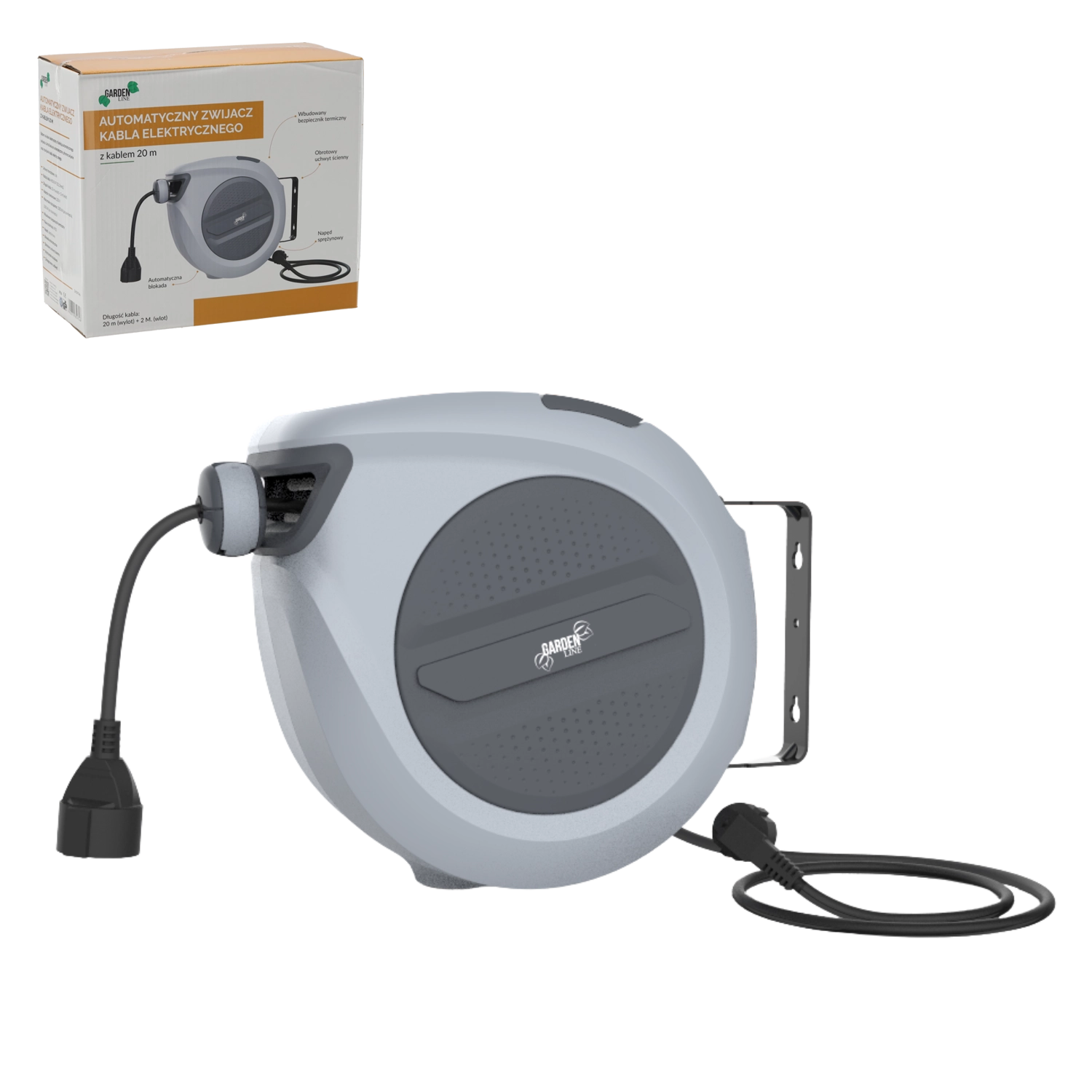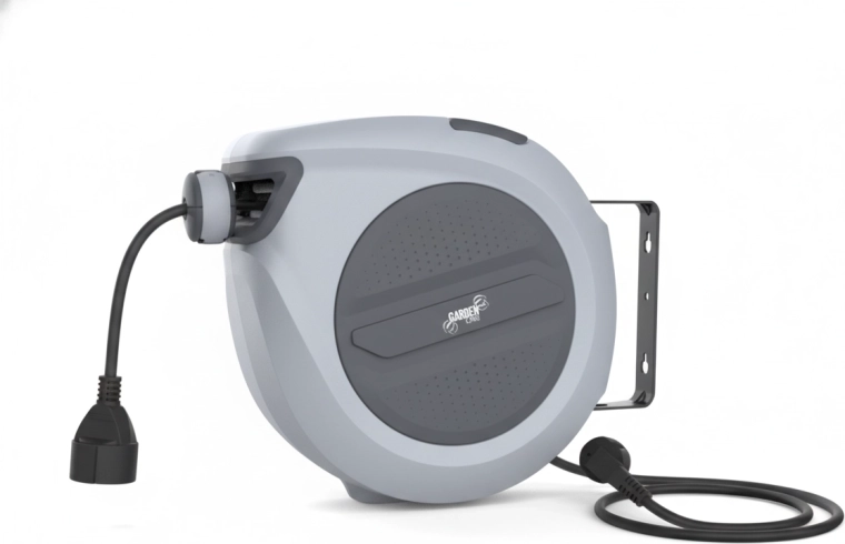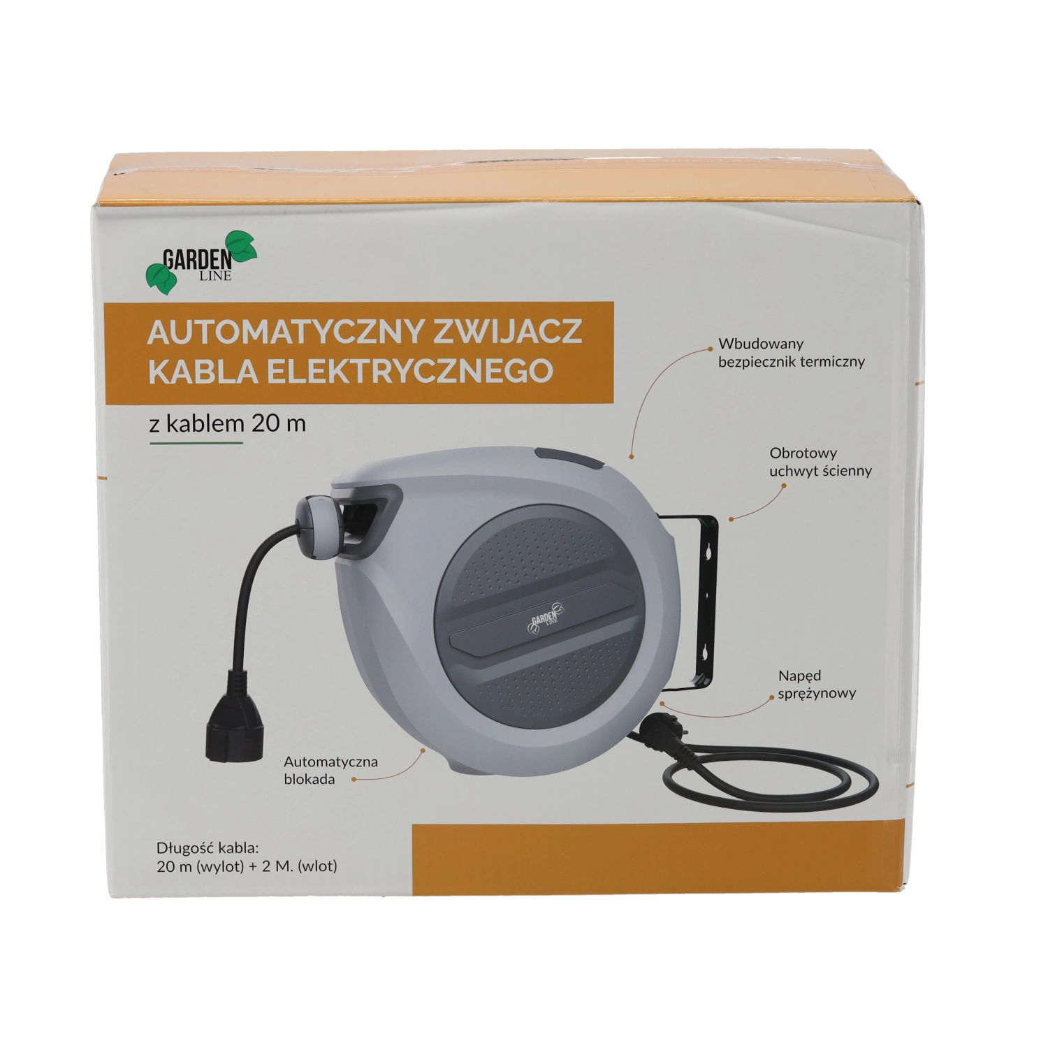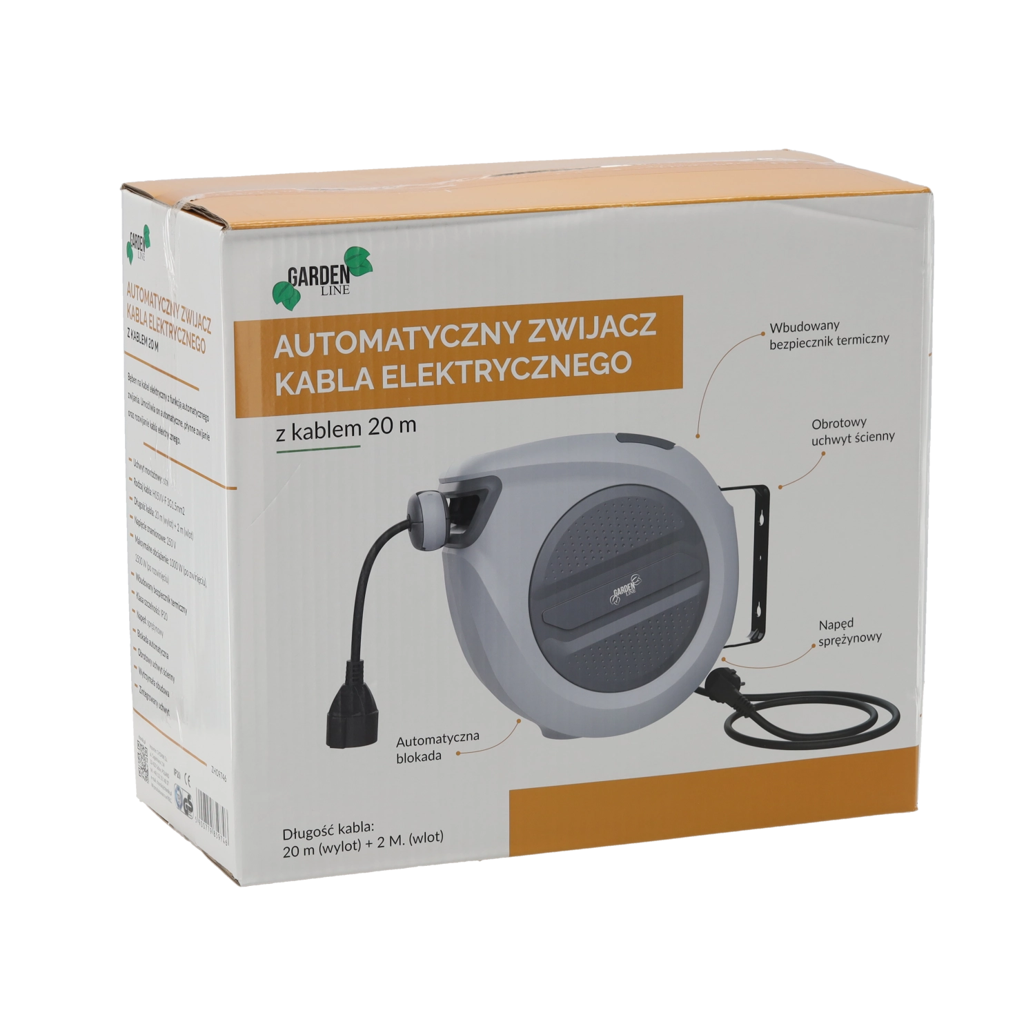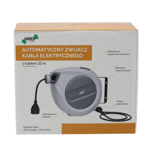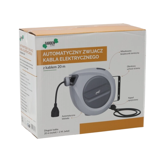 De automatische haspel voor een elektrische kabel van 20 m maakt uw dagelijkse werkzaamheden eenvoudiger. De kabel schuift soepel uit en blijft dankzij de vergrendeling op de gewenste lengte; na ontgrendelen keert hij dankzij het veermechanisme veilig en netjes terug. Het geïntegreerde thermische beveiligingselement beschermt zowel de haspel als aangesloten apparaten.