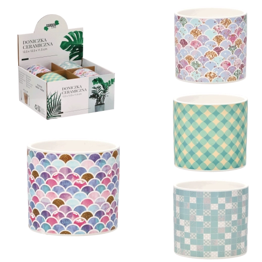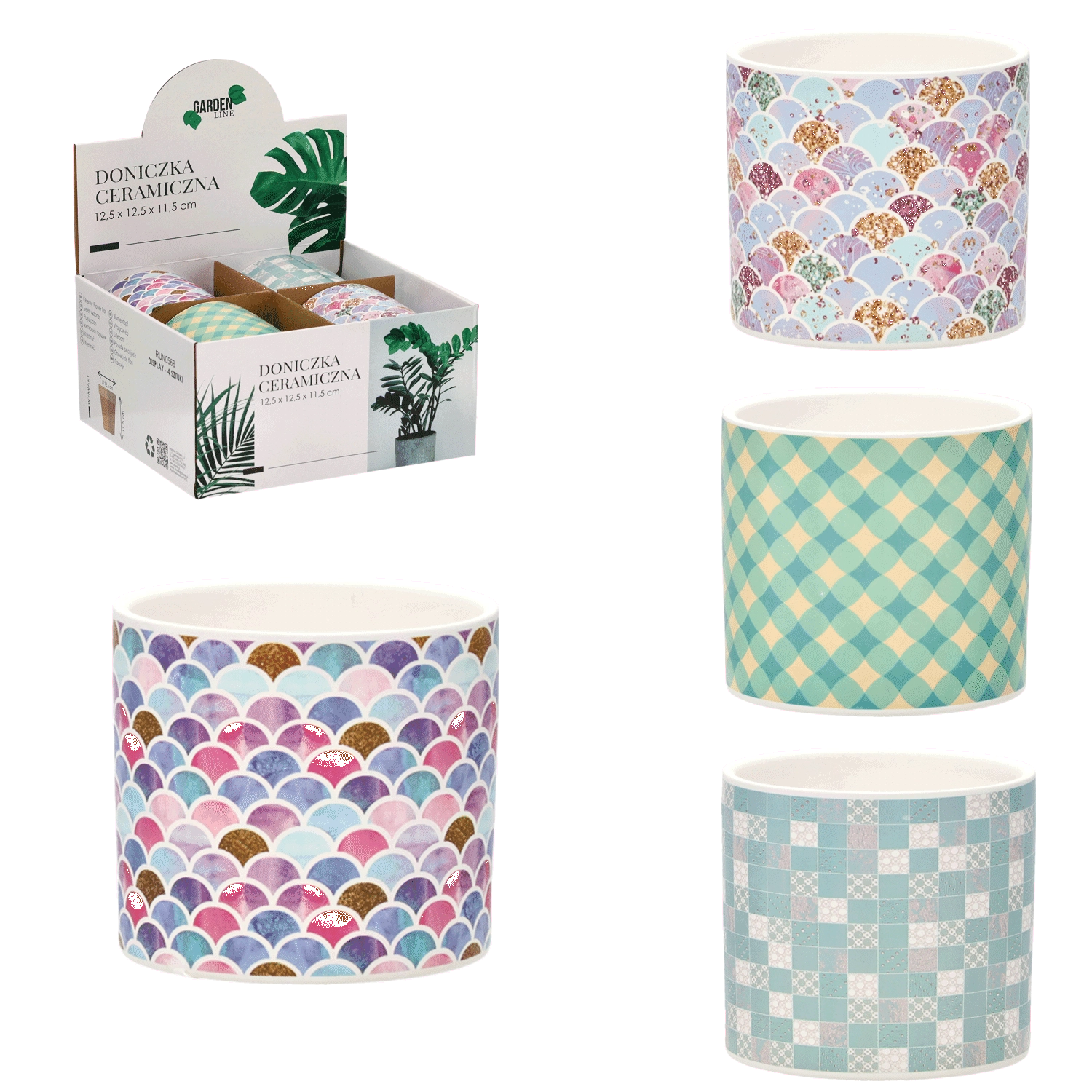 Stijlvolle keramische bloempotcover in een universele maat die elke interieurruimte en terras mooi aanvult. Biedt een elegante uitstraling, duurzame keramische afwerking en natuurlijke luchtcirculatie voor gezonde wortels. Wordt verkocht in een mix van patronen.
