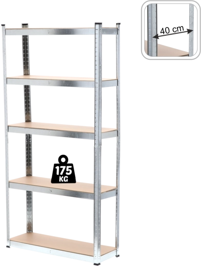 De robuuste stellingkast met vijf legborden combineert verzinkte stalen profielen en duurzame MDF-platen voor een lange levensduur en veilige opslag van gereedschap, dozen en voorraden. De verstelbare hoogte van de legborden maakt efficiënte benutting van de verticale ruimte mogelijk en past de stelling aan voor objecten van verschillende grootte. Verstevigingen onder elk legbord verhogen de stijfheid van de constructie en zorgen voor stabiliteit, zelfs bij hogere belasting.