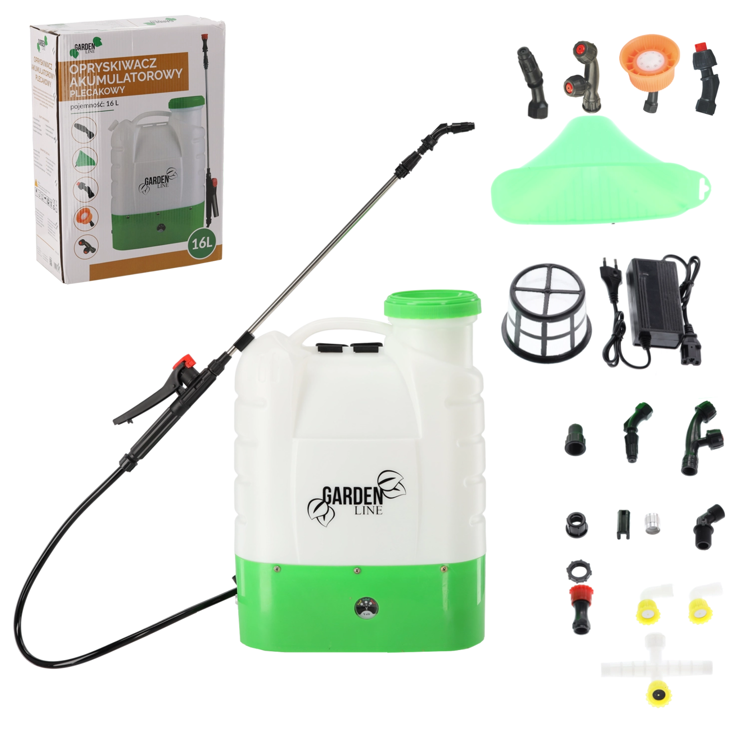 Inclusief een uitgebreide set accessoires: meerdere soorten sproeikoppen voor verschillende spuitbeelden, een metalen/composiet spuitlans met pistool, slang, oplader en een filterzeef tegen vuildeeltjes. De geïntegreerde laadstatusindicator, zekering en het eenvoudige bedieningspaneel garanderen een veilige en intuïtieve werking.
