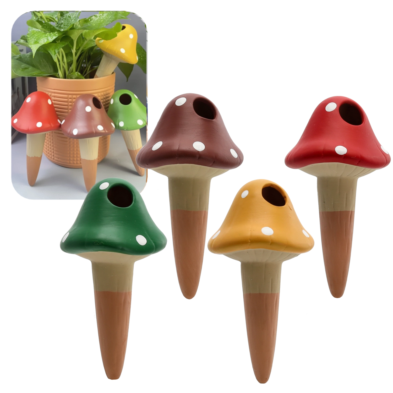 Werkt uitstekend in bloempotten, balkonbakken en hangende potten. Het decoratieve design met gestippelde hoed geeft je planten een speelse look en blijft tegelijk volledig functioneel. Verkrijgbaar in een mix van kleuren (groen, rood, bruin, geel), zodat je de uitstraling gemakkelijk op je interieur of seizoensdecoratie kunt afstemmen.
