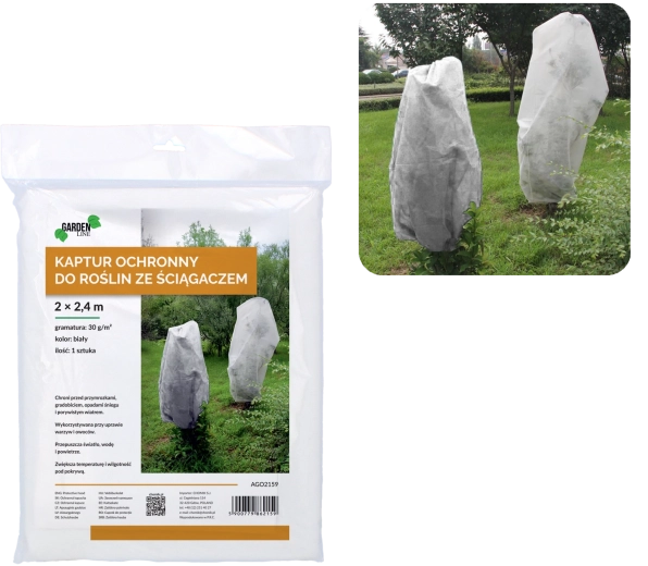 Dankzij de afmetingen 2 × 2,4 m bedekt de hoes eenvoudig ook grotere planten. Het onderste deel is voorzien van een praktisch trekkoord, waarmee je snel kunt vastzetten zonder extra hulpmiddelen. Het materiaal is licht, ademend en lichtdoorlatend, zodat planten niet gaan broeien.