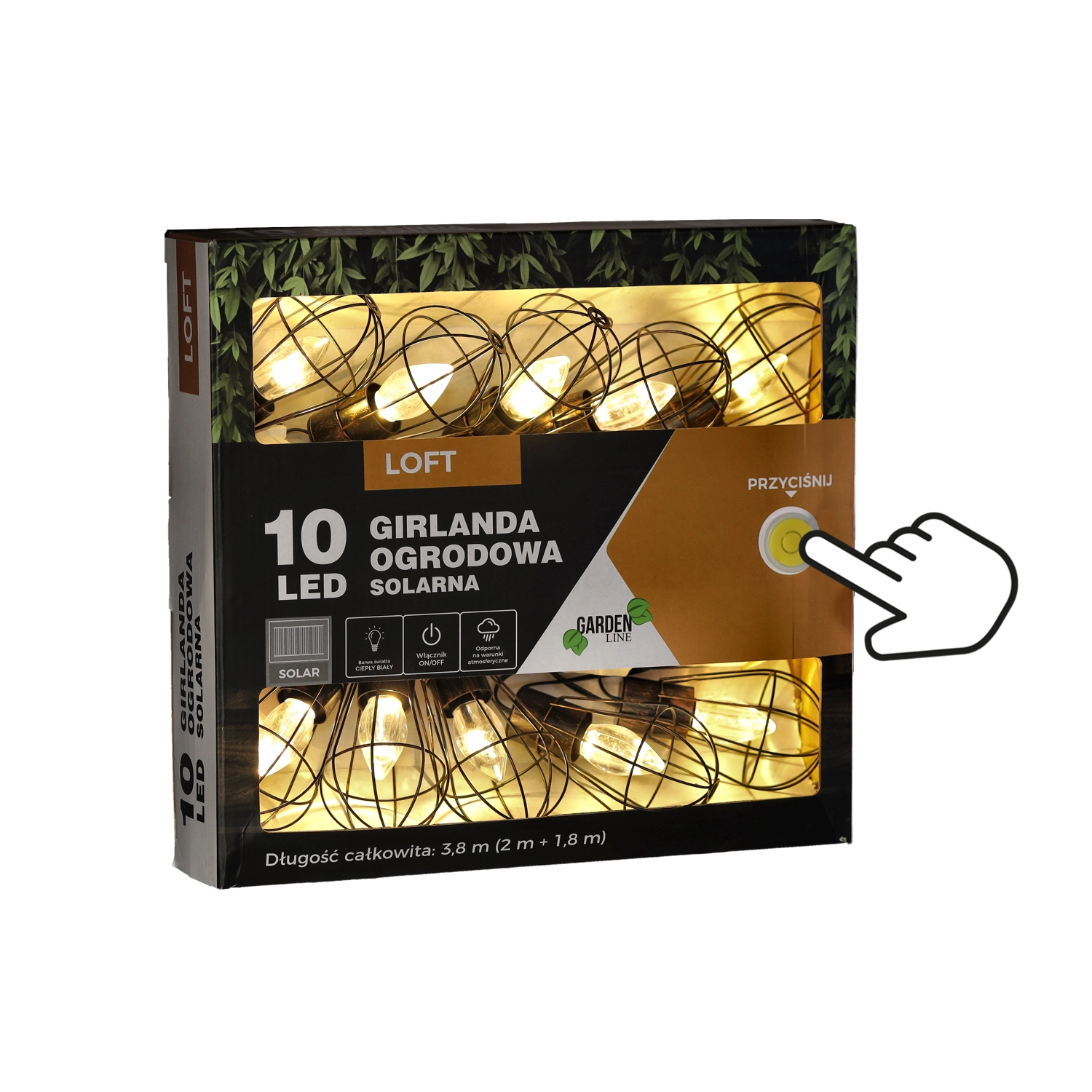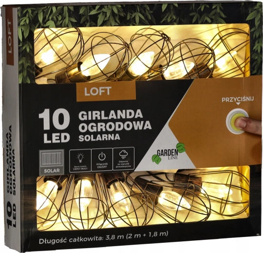 Geef balkon, terras en tuin een betoverende sfeer met een zonne-energieslinger in industriële loftstijl. 10 LED’s met warm wit licht branden tot 6–7 uur na het opladen. Ze worden gevoed door een zonnepaneel met ingebouwde batterij en dankzij IP44 bestand tegen regen en vocht. De praktische lengte van 3,8 m (2 m aanvoerkabel + 1,8 m lichtsnoer) en 20 cm tussenafstand tussen de lampen zorgen voor gelijkmatige, knusse verlichting zonder stopcontact.