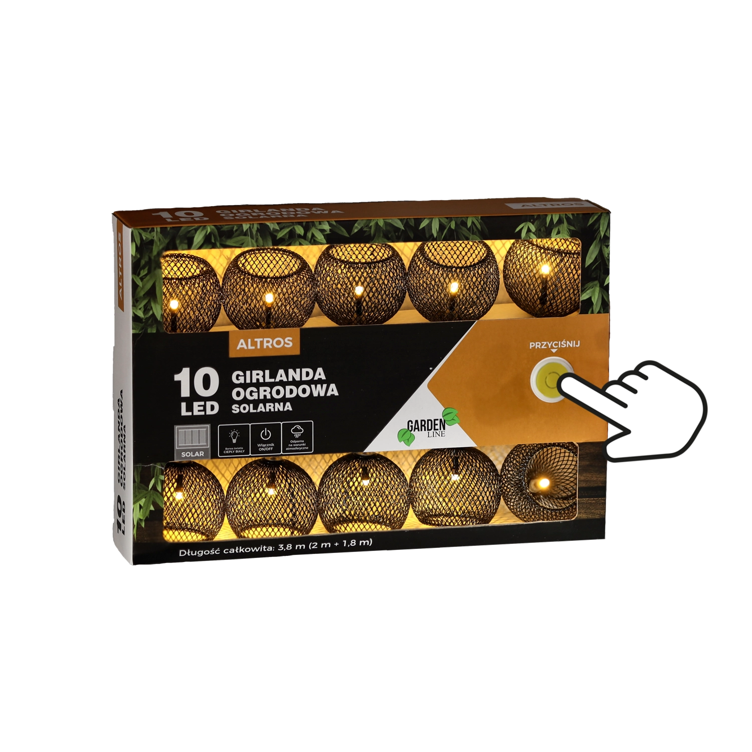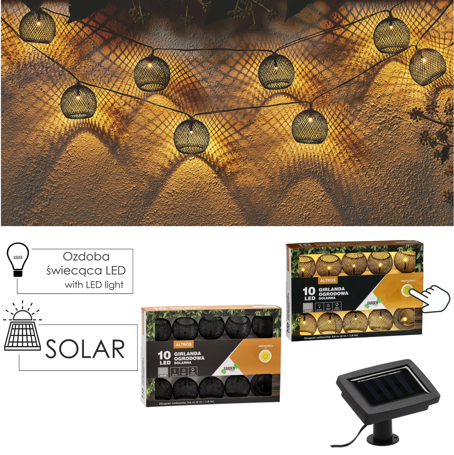 Stijlvolle zonne-lichtslinger ALTROS met 10 LED's in warm wit verlicht balkon, terras en tuin. Dankzij zonnevoeding volledig snoerloos en energiebesparend. Biedt 2 lichtstanden (continu/knipperend), IP44 waterbestendigheid en een totale lengte van 3,8 m voor eenvoudig decoreren.
