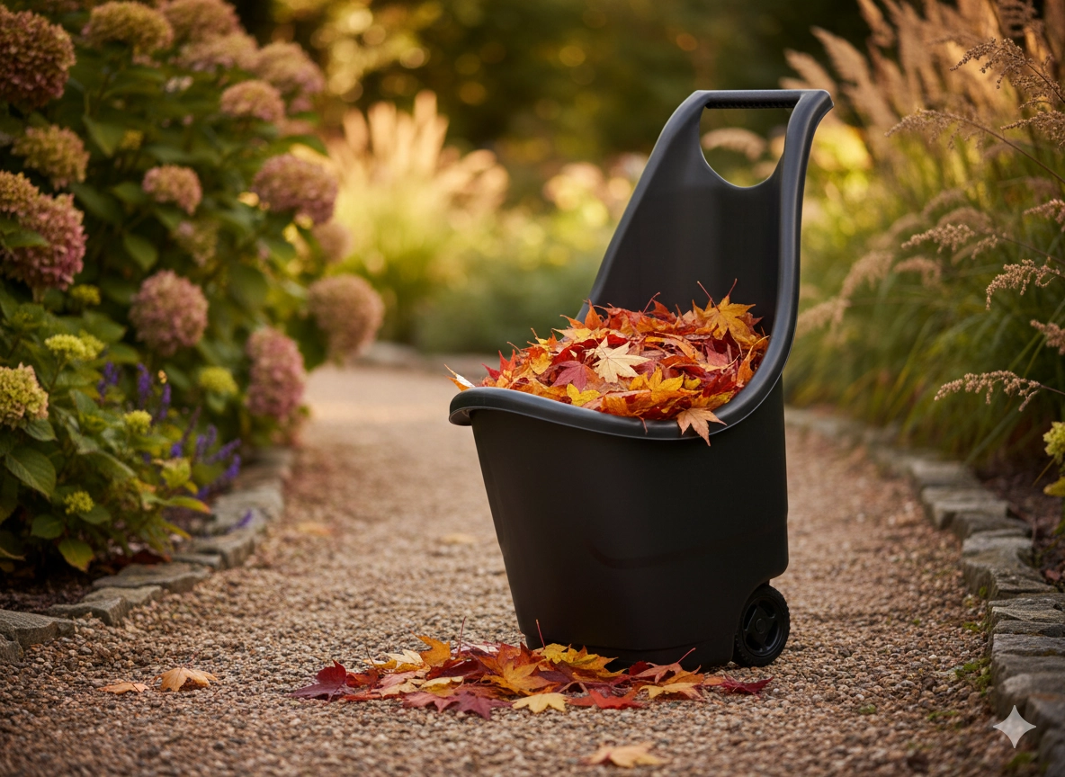 De ruime bak met 50 l inhoud en een versterkte bovenrand biedt gemakkelijk plaats aan bladeren, gras of aarde en is bestand tegen dagelijks gebruik.