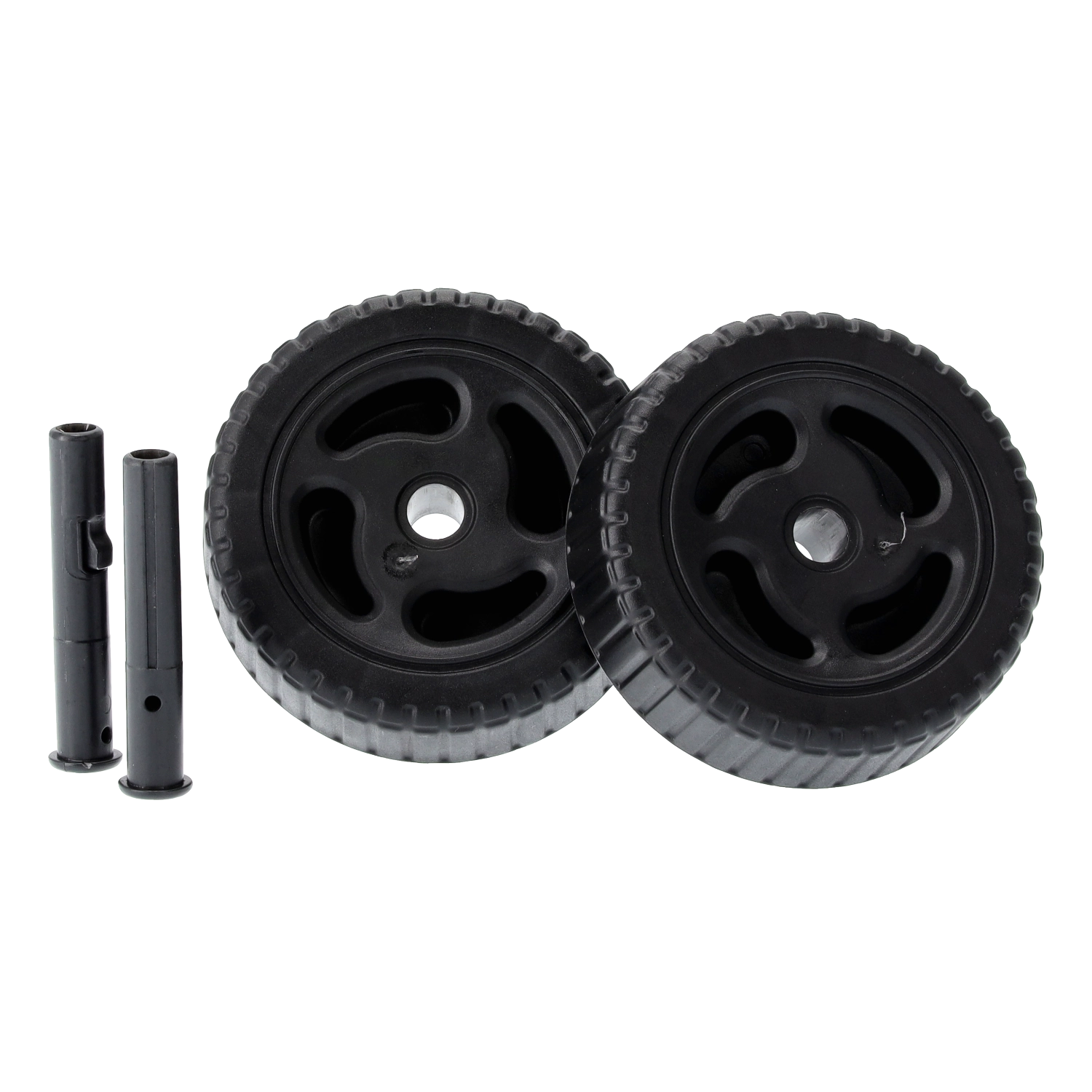 Twee robuuste kunststof wielen en een uitgebalanceerd zwaartepunt zorgen voor soepele beweging over gazon, grind en bestrating zonder onnodige inspanning.