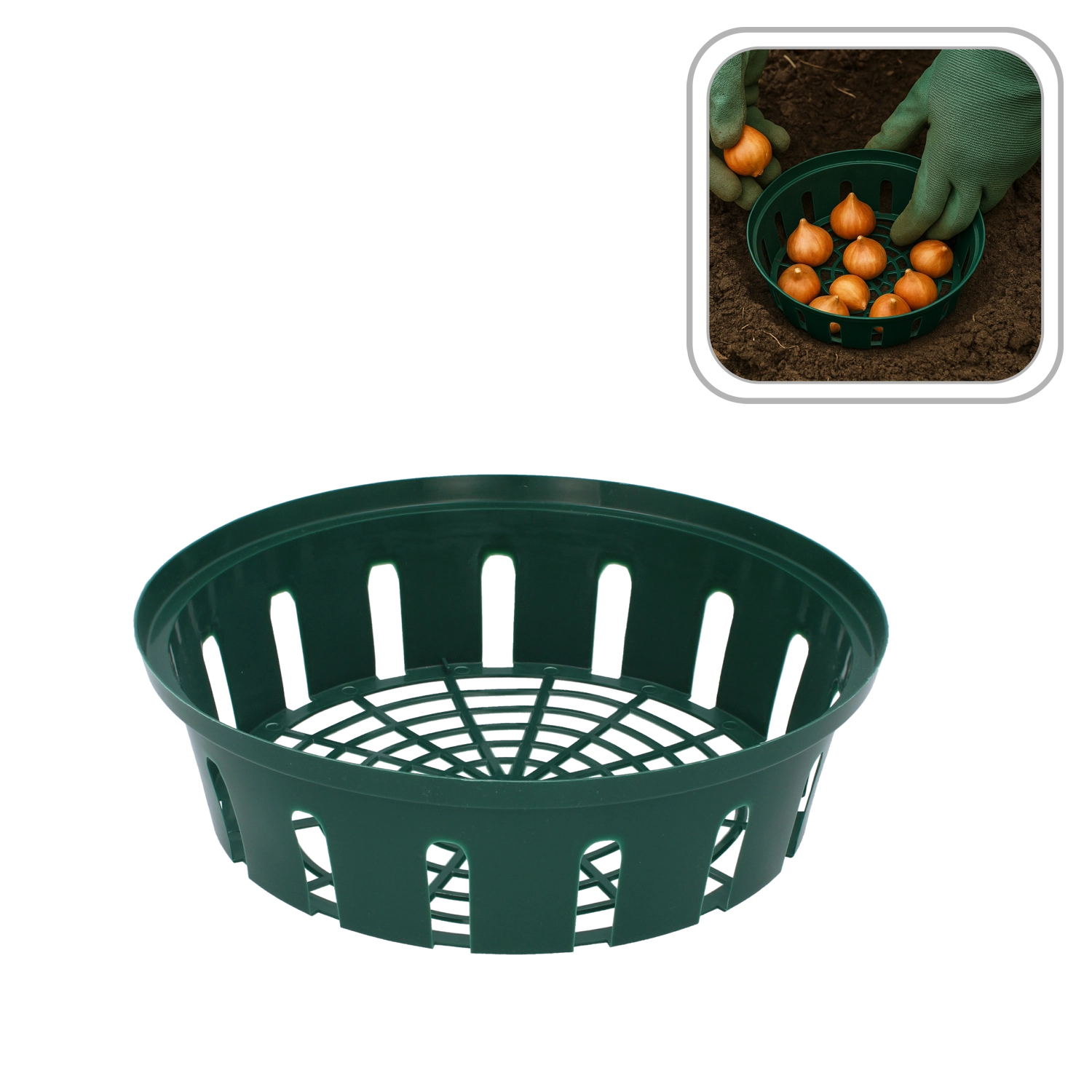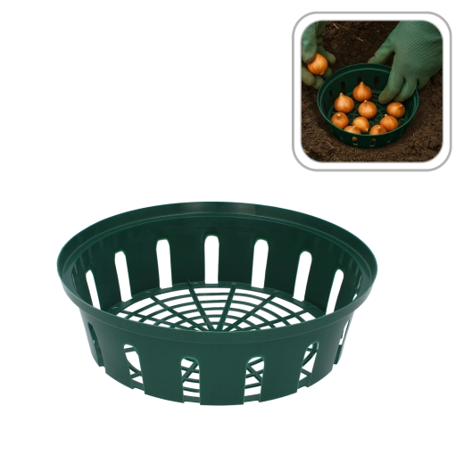 De mand is gemaakt van duurzaam kunststof dat zonder problemen bestand is tegen ongunstige weersinvloeden. Dankzij de universele afmetingen is hij geschikt voor een breed scala aan bloembollen – van tulpen en narcissen tot hyacinten – en is hij uitstekend geschikt voor herhaald seizoensgebruik.