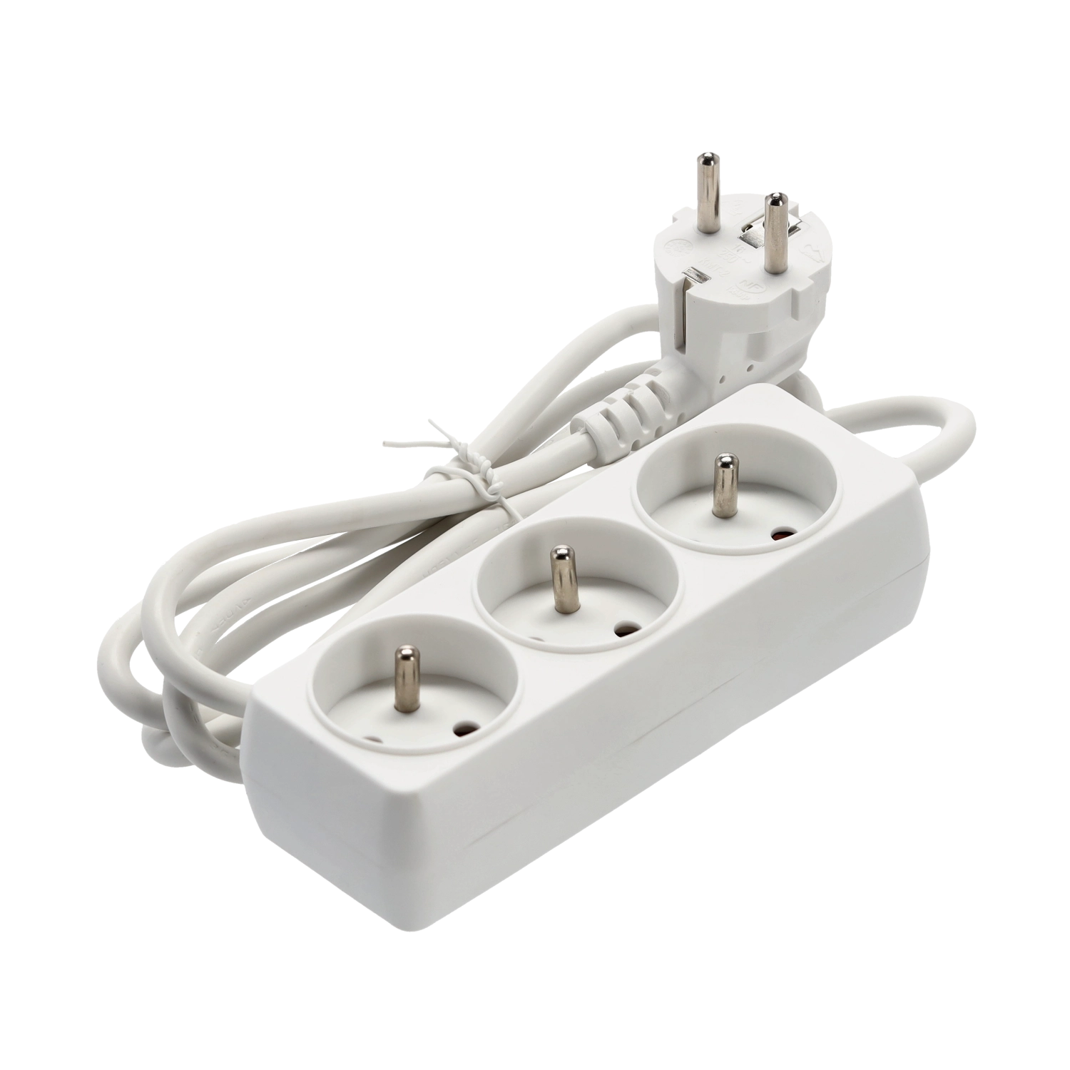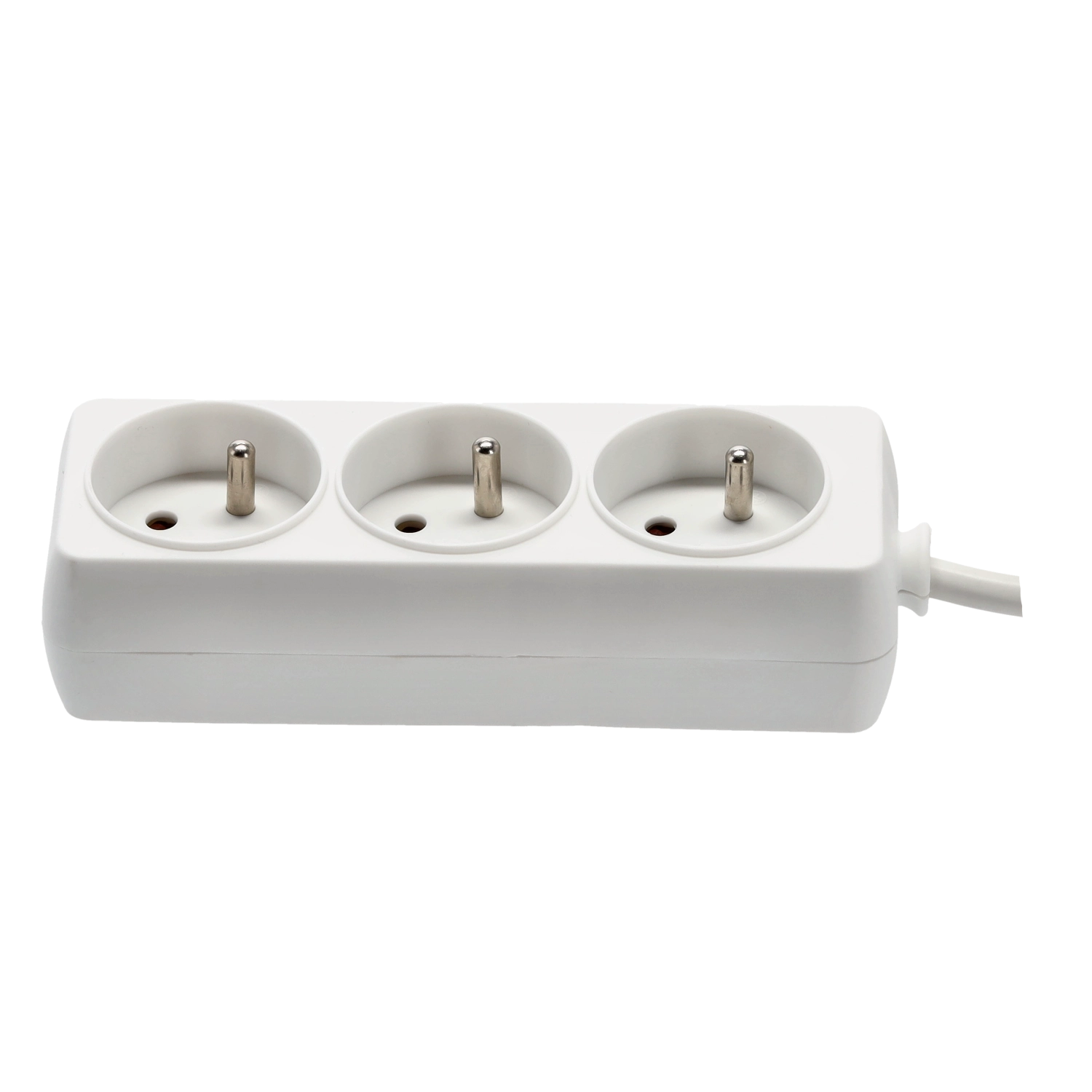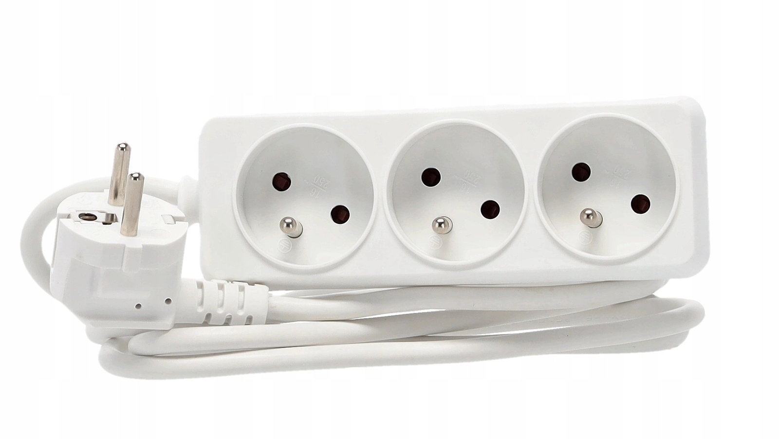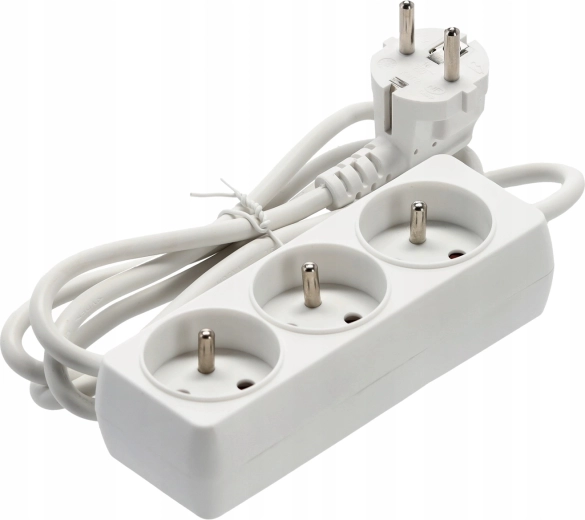Praktische witte verlengdoos met 3 geaarde stopcontacten en een kabel van 1,5 m voor het gelijktijdig voeden van meerdere apparaten. Duurzame behuizing van kwaliteitskunststof, koperen geleider 3×1,0 mm² voor betrouwbare prestaties en een maximale belasting van tot 3680 W bij 250 V/16 A. Geschikt voor thuis en kantoor.