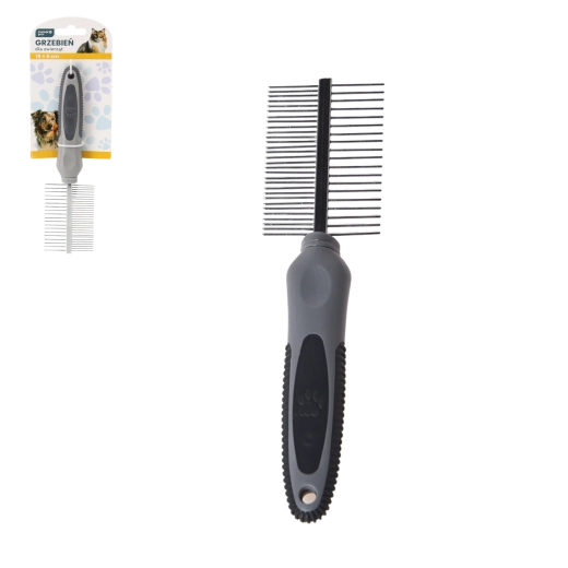 Praktische dubbelzijdige kam voor honden en katten met afmetingen 19 × 5 cm, een uitstekende hulp voor de dagelijkse vachtverzorging. Dankzij twee typen tanden zorgt hij voor effectief uitkammen, eenvoudig verwijderen van klitten en bevordert een gezonde, glanzende uitstraling. De ergonomische gerubberde handgreep garandeert een comfortabele en veilige grip tijdens het kammen.