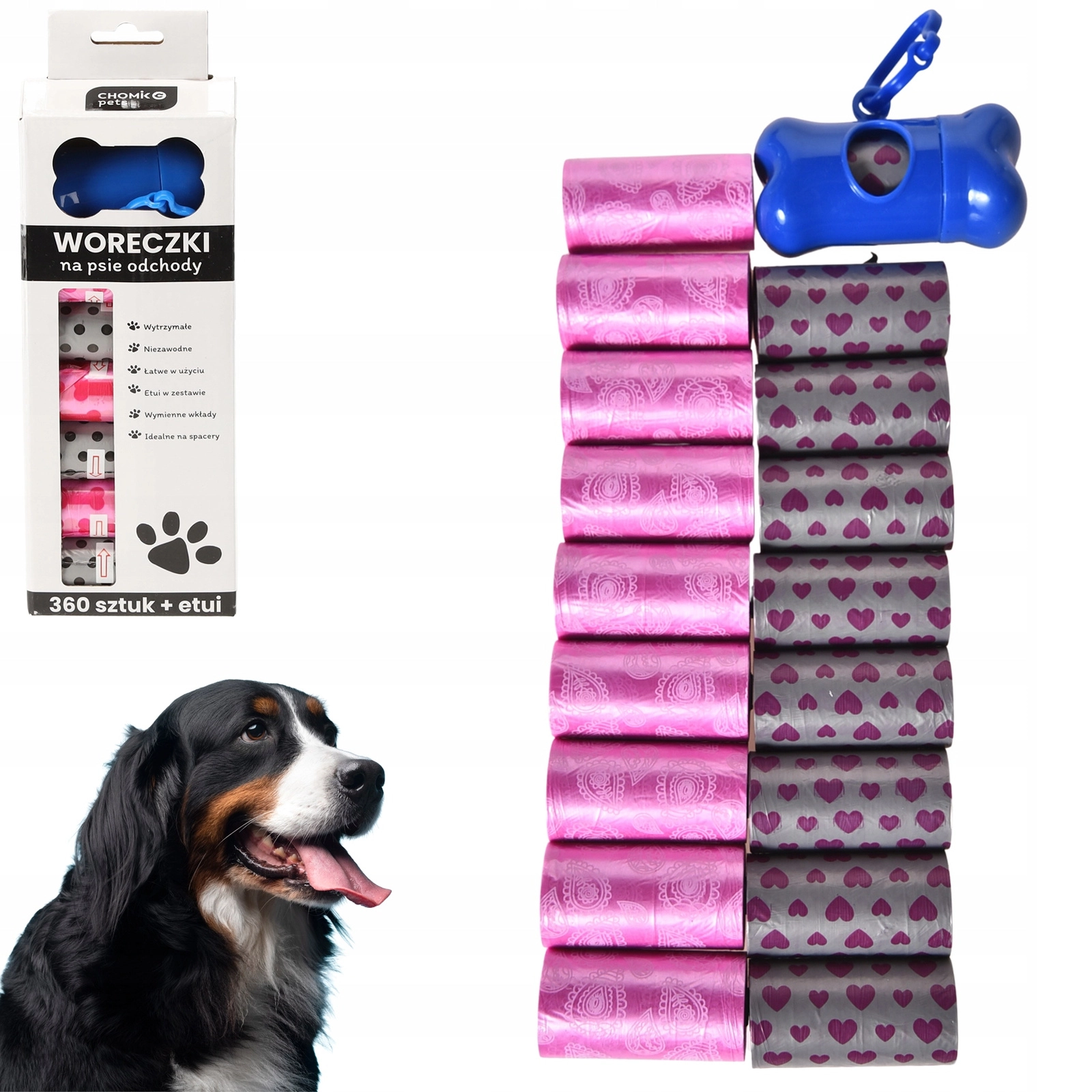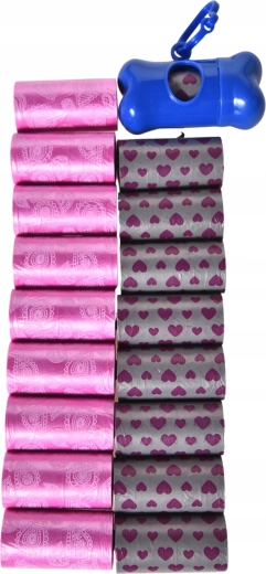 De set bevat een compacte etui/dispenser met clip die je aan de lijn, tas of riem kunt bevestigen. De rolletjes zijn klein en ruimtebesparend, zodat ze weinig plaats innemen en je ze altijd bij de hand hebt – zowel in de stad als in de natuur.