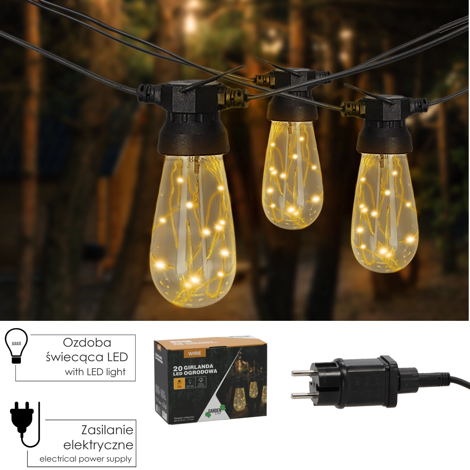 Creëer een magische sfeer op het terras, balkon en in de tuin met een lichtsnoer van 20 m met 20 energiezuinige LED's in de kleur warm wit 3000K. Dankzij de voeding van 12 V, de IP44-bescherming en de praktische bevestigingshaken voor ophanging is de installatie eenvoudig en veilig – ideaal voor buiten- en binnengebruik.