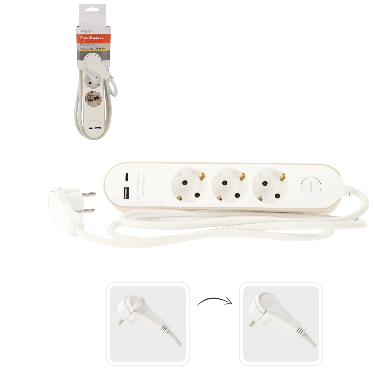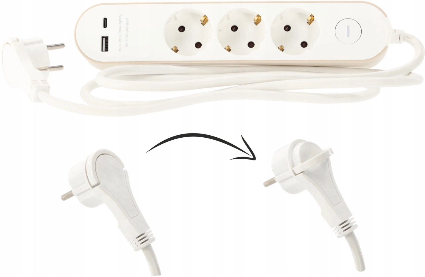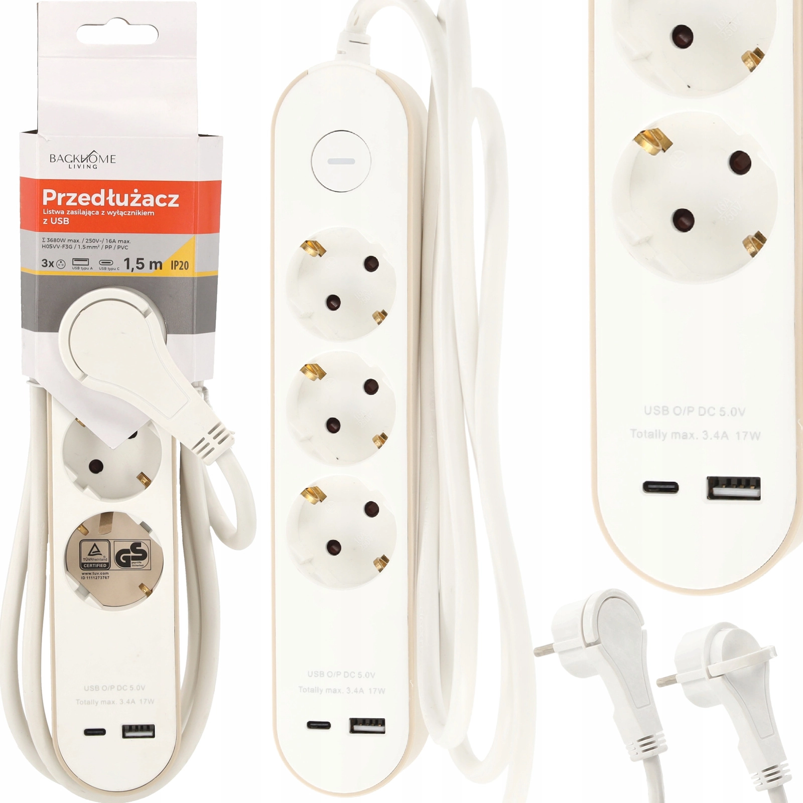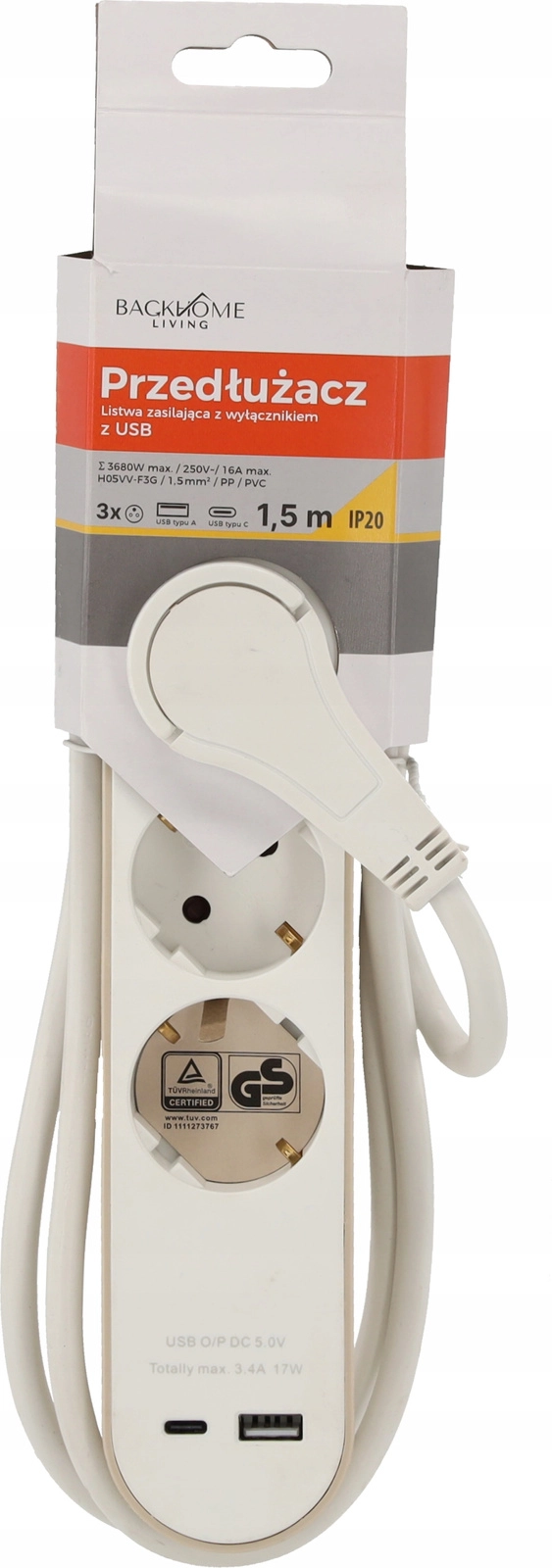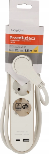 Deze witte stekkerdoos combineert drie Schuko-stopcontacten (16 A, 250 V) en twee USB-uitgangen – één USB-A en één USB-C – met een totaal USB-vermogen tot 17 W (5 V/3,4 A). Dankzij de compacte afmetingen past hij op het bureau, onder de tv of naast het nachtkastje en kan hij apparaten voeden terwijl hij tegelijk een telefoon of tablet oplaadt.