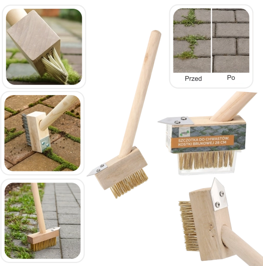 Compacte en duurzame onkruid- en voegborstel van 28 cm reinigt doeltreffend de ruimtes tussen bestratingsstenen en stoeptegelplaten. Combineert stevige metalen borstelharen met een schrapende stalen rand voor het verwijderen van mos, gras en hardnekkig vuil. Dankzij het ergonomische houten handvat ligt hij prettig in de hand en vergemakkelijkt hij het regelmatig onderhoud van terras, trottoirs en opritten.
