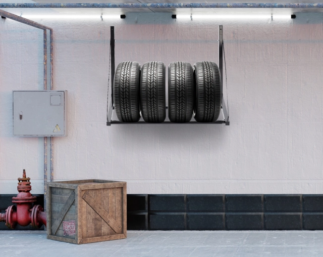 - Ruimtebesparend – banden hangen aan de muur, de vloer blijft vrij.