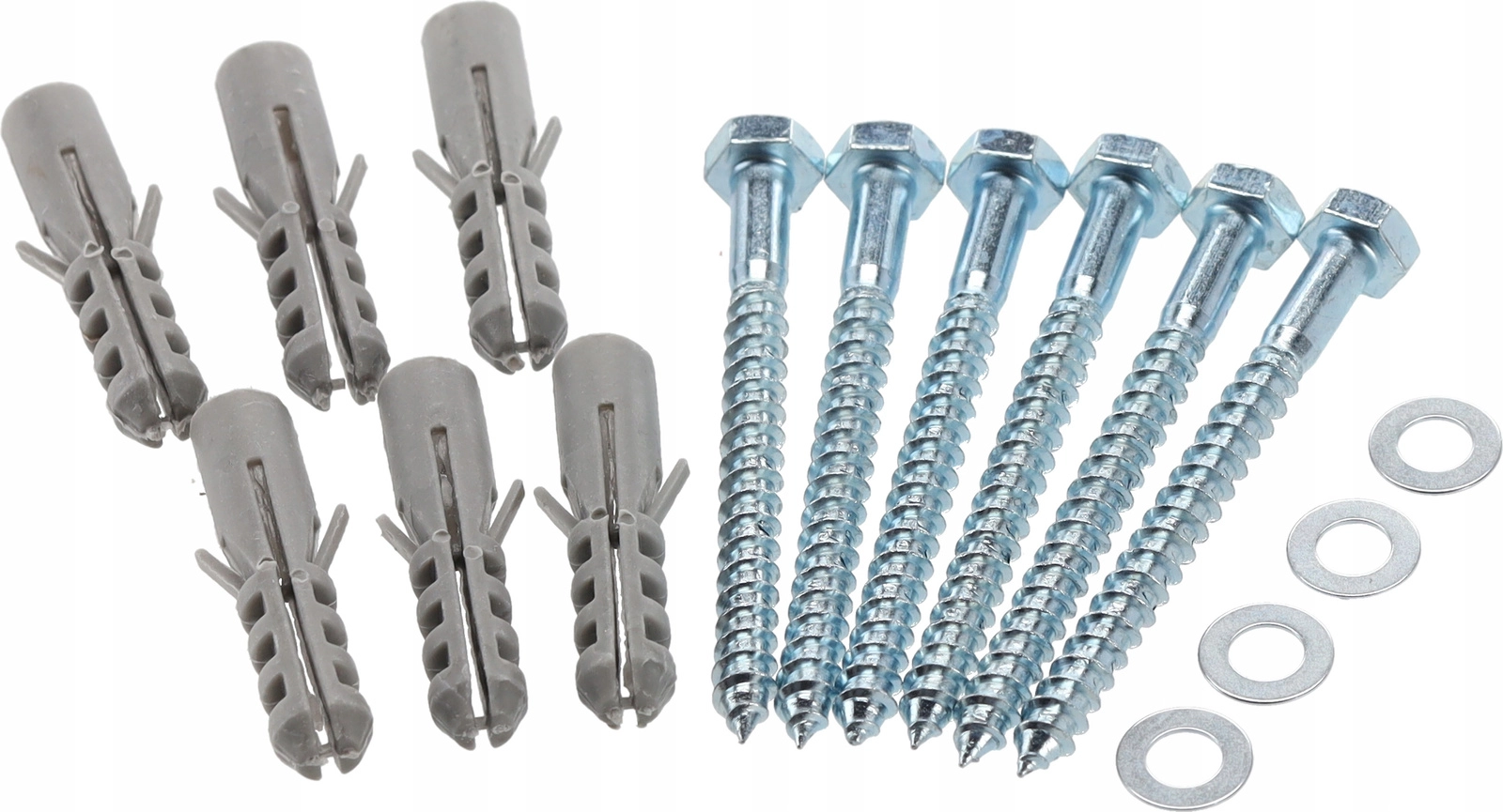 De set bevat pluggen, schroeven en ringen voor een snelle en betrouwbare wandmontage.