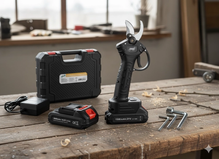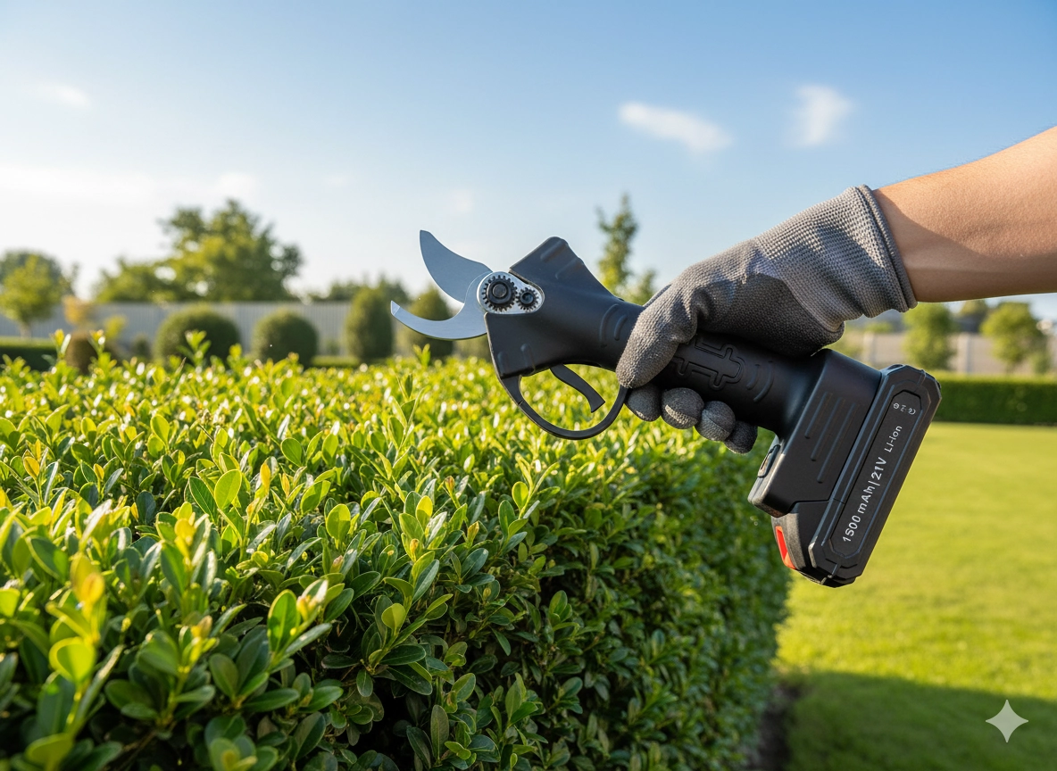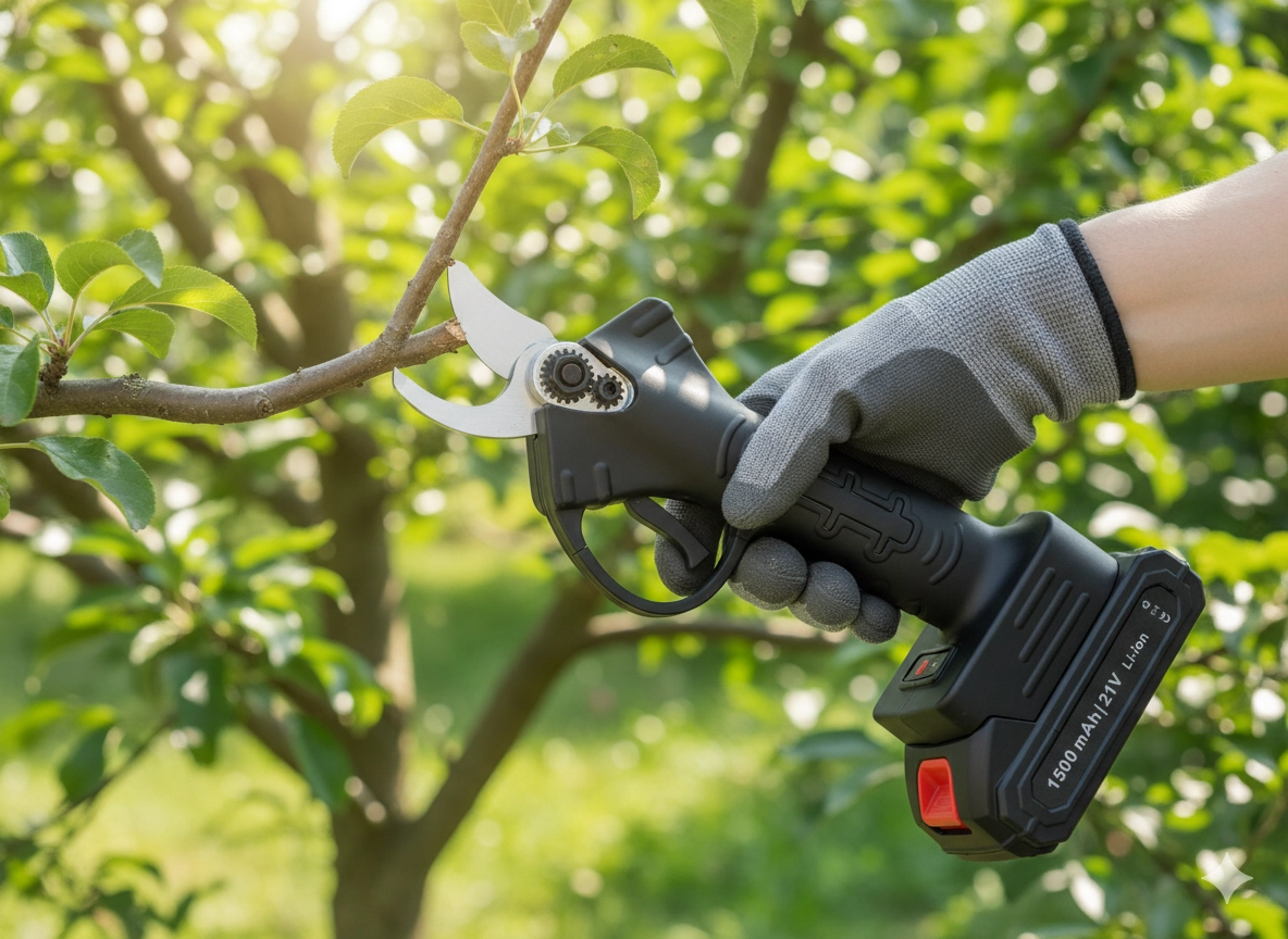 Krachtige accu-snoeischaar versnelt het snoeien van rozen, jonge fruitbomen en hagen – een schone snede bevordert gezonde plantengroei.