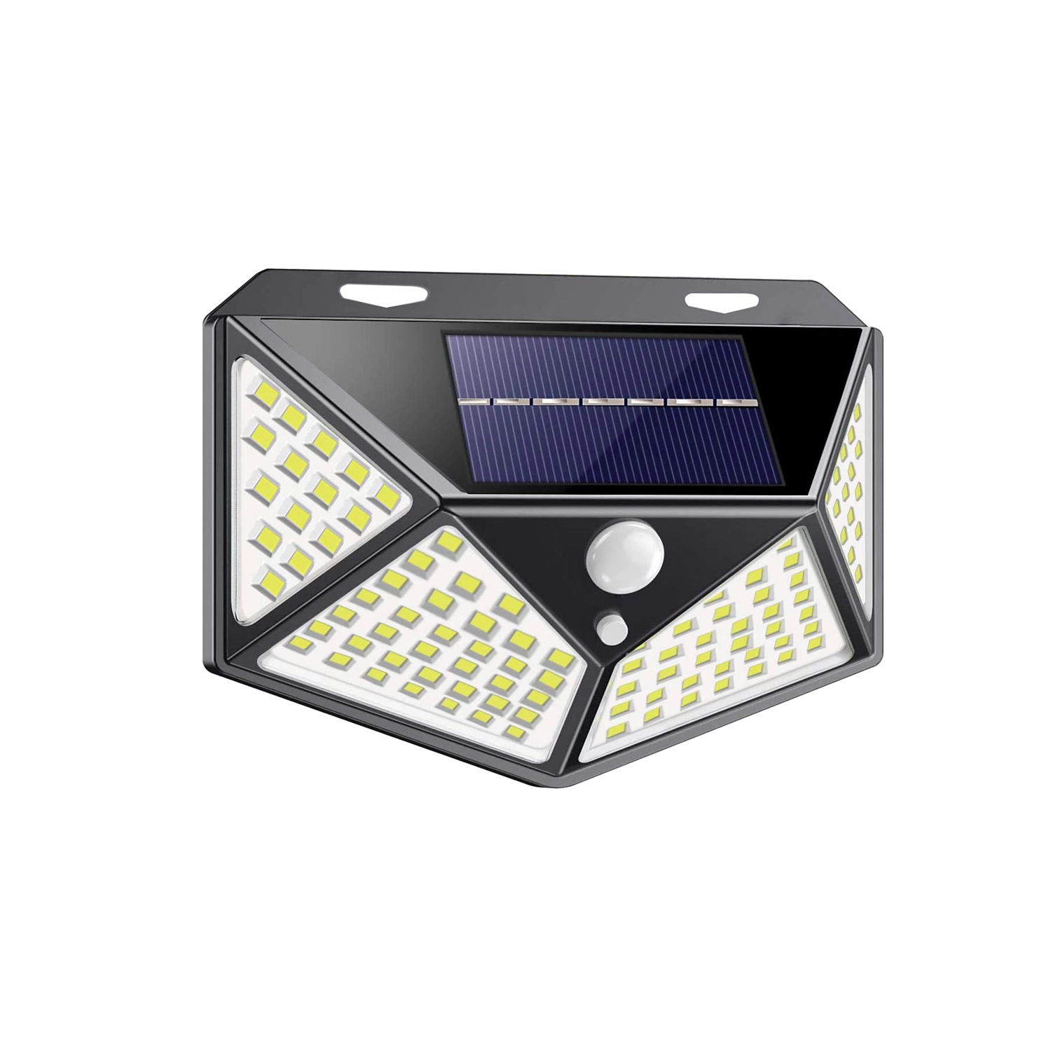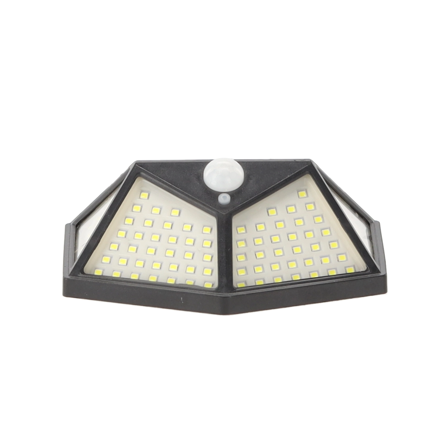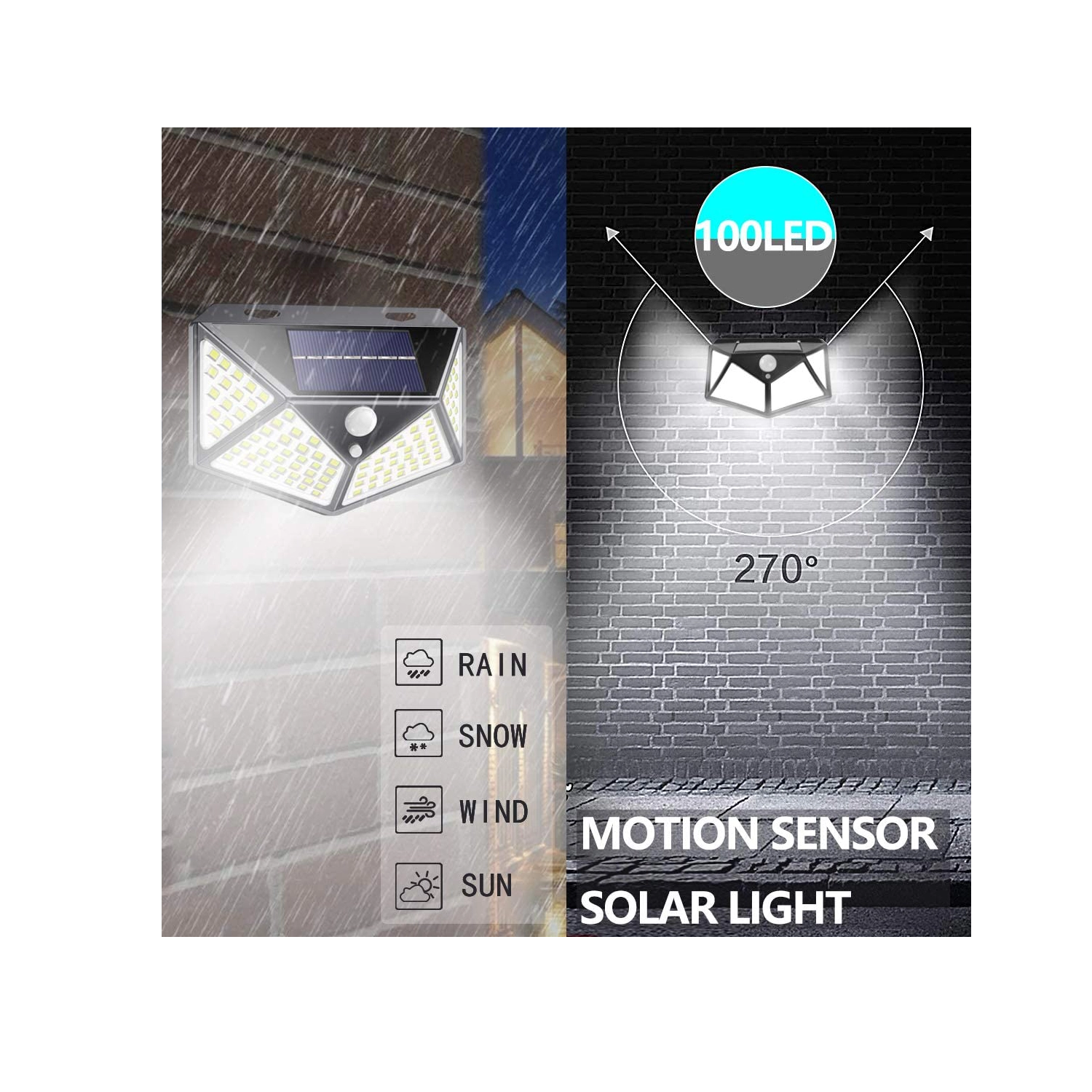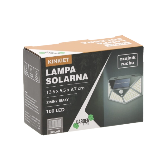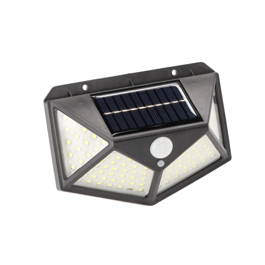 De praktische buitenlamp met zonne-energie biedt groothoekverlichting dankzij het dichte veld van 100 LED’s. De geïntegreerde PIR-sensor reageert op beweging – het licht schakelt in bij detectie en uit bij geen activiteit, zodat je verzekerd bent van een veilige doorgang en energiebesparing.