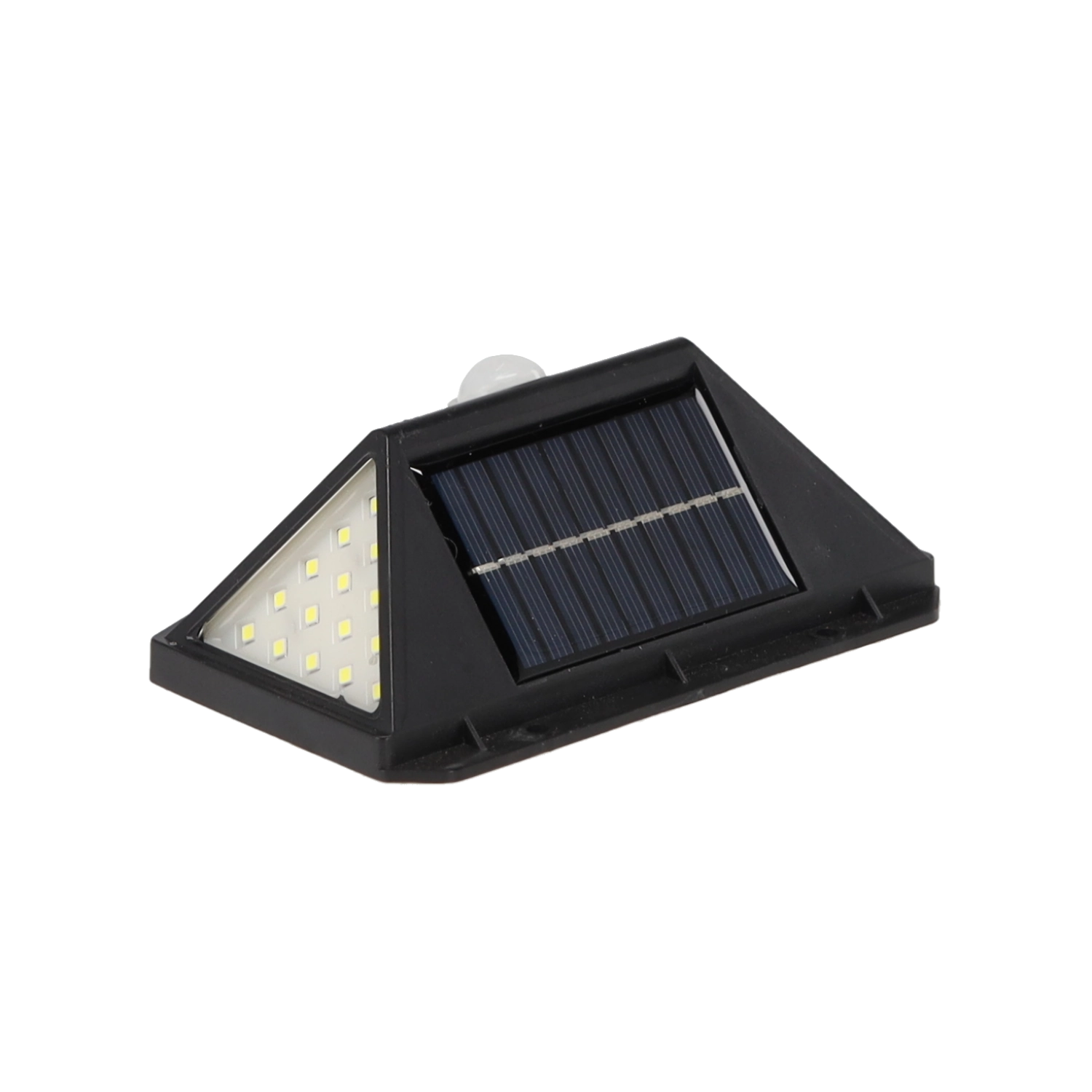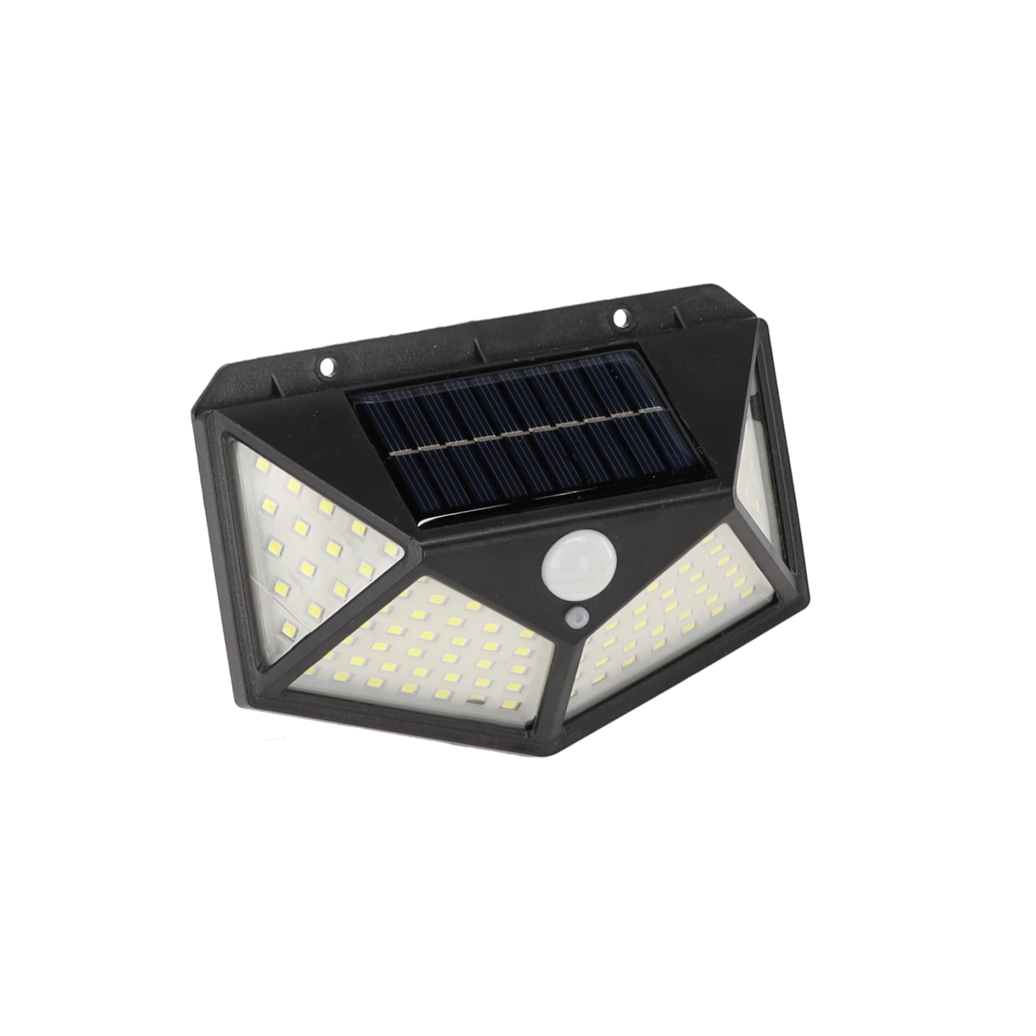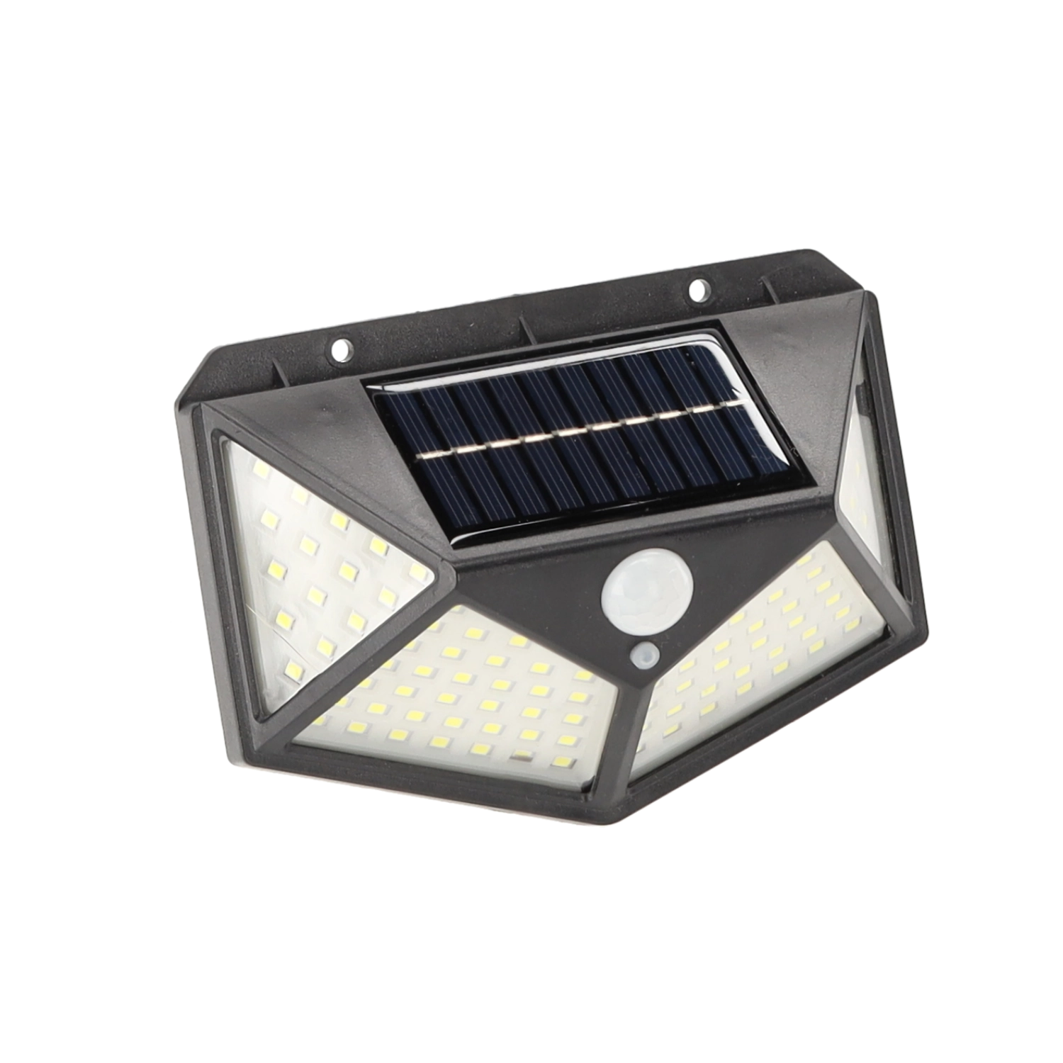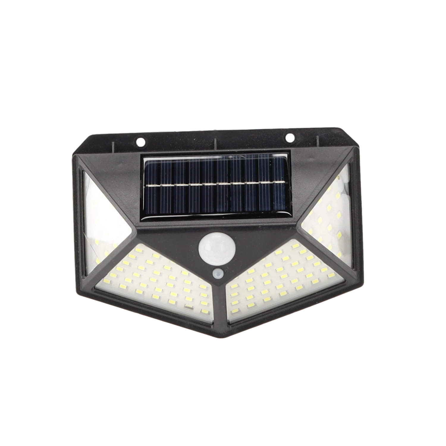 De praktische buitenlamp met zonne-energie biedt groothoekverlichting dankzij het dichte veld van 100 LED’s. De geïntegreerde PIR-sensor reageert op beweging – het licht schakelt in bij detectie en uit bij geen activiteit, zodat je verzekerd bent van een veilige doorgang en energiebesparing.