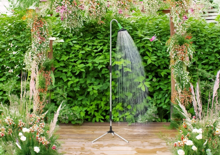 De robuuste driepoot houdt de douche stevig op zijn plaats, zowel op het gazon als op een houten terras. Je zet hem zonder boren en zonder gereedschap neer en hij is in enkele seconden klaar voor gebruik.