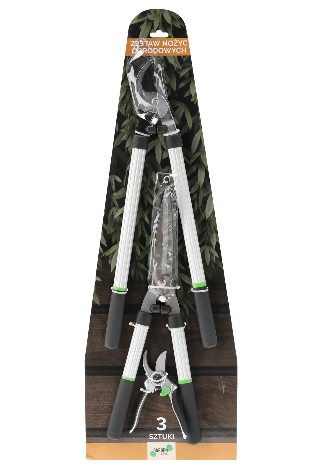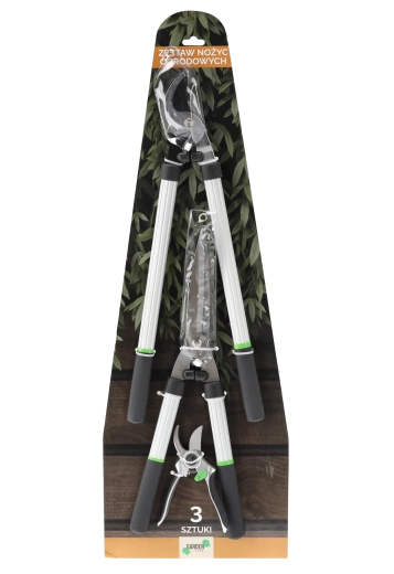 In de verpakking: takkenschaar (54 cm) met grote hefboomwerking voor een zuivere snede van levend hout, heggenschaar (51 cm, bladlengte 20 cm) voor gelijkmatig vormen en een compacte bypass-snoeischaar voor snel en precies knippen van stengels en kleinere twijgen.