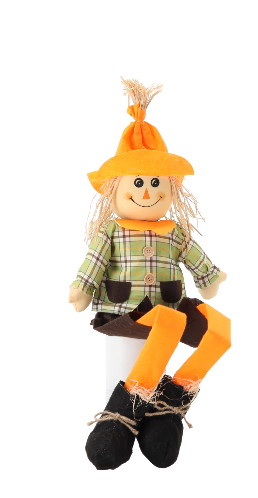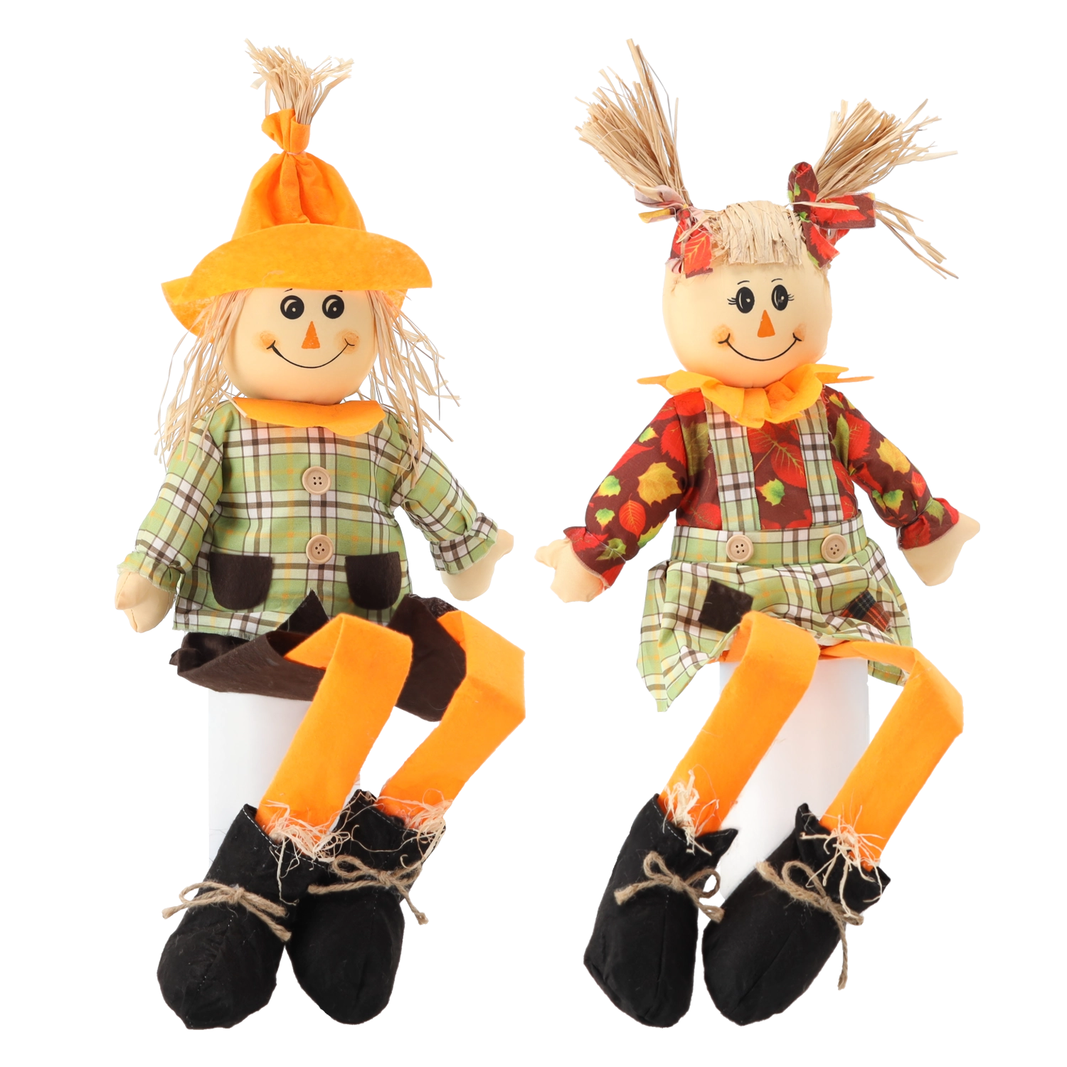 Een duo zittende vogelverschrikkers met bungelende benen past perfect op planken, vensterbanken en entree tafels en benadrukt de herfstsfeer.