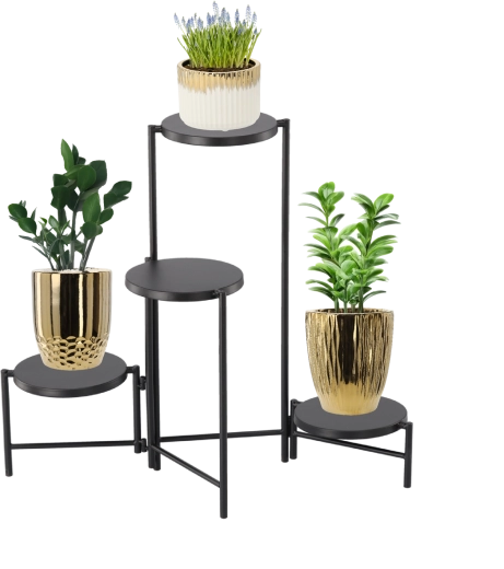 Elegante metalen plantenstandaard met vier niveaus van duurzaam metaal biedt voldoende ruimte voor meerdere bloempotten, zelfs in kleinere ruimtes. Dankzij het minimalistische ontwerp in zwarte kleur past hij perfect in moderne, loft- en klassieke interieurs. De stabiele constructie met poedercoating garandeert een lange levensduur en eenvoudig onderhoud – afnemen met een vochtige doek is voldoende.