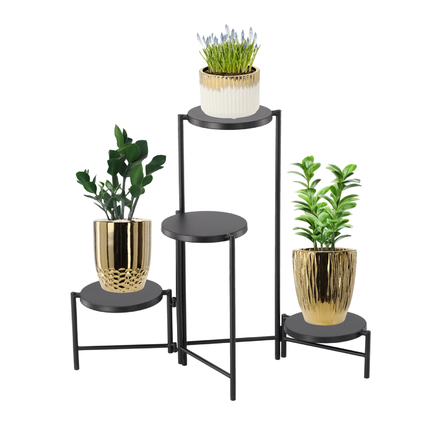 Creëer een indrukwekkende groene compositie met deze metalen plantenstandaard met vier niveaus die ruimte bespaart en tegelijk stijl toevoegt. De stabiele constructie draagt veilig bloempotten in diverse formaten en dankzij de poedercoating is hij bestand tegen corrosie en dagelijks gebruik.