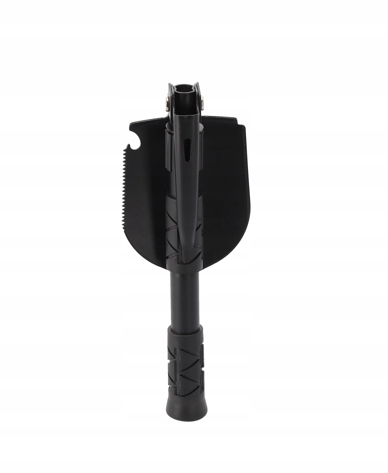 Dankzij de opvouwbare constructie krimpt de schop tot slechts 16 cm, zodat hij probleemloos in een rugzak of dashboardkastje past. Het vergrendelmechanisme van het scharnier houdt het gereedschap stevig in de gekozen stand en de getextureerde greep biedt een zekere houvast. Een duurzame etui is inbegrepen voor veilig opbergen en snel bevestigen.