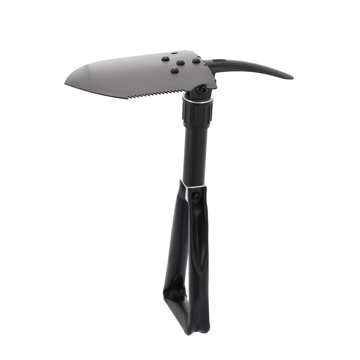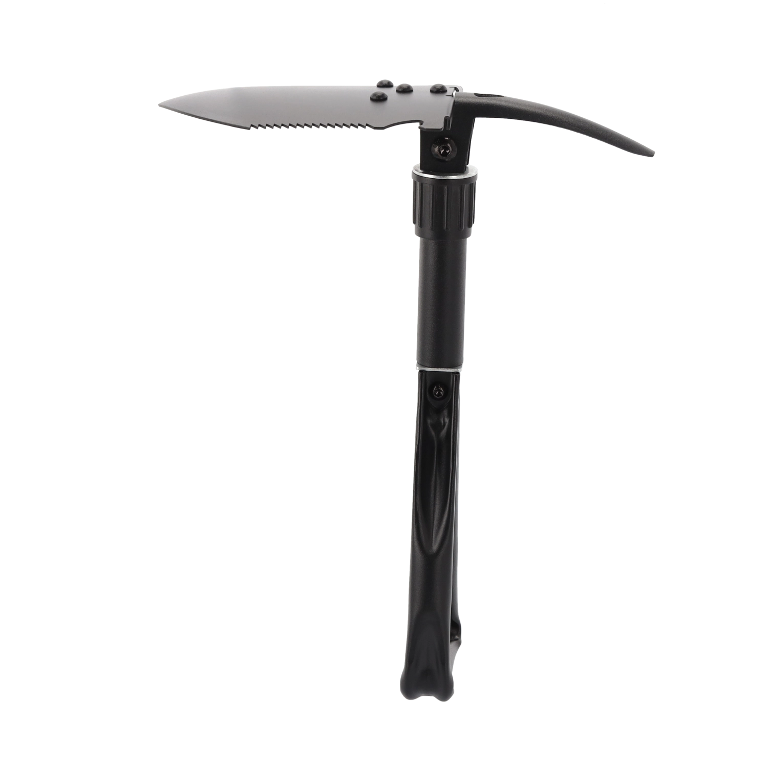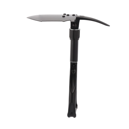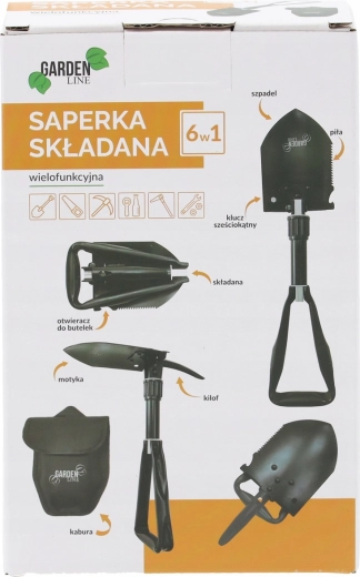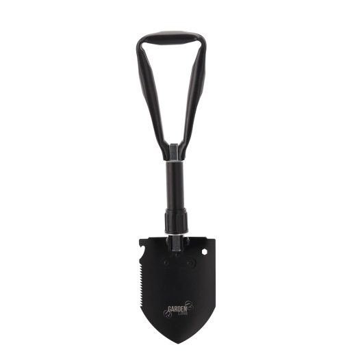 Deze duurzame opvouwbare schep combineert schop, hak, zaag, houweel, zeskantsleutel en flesopener in één gereedschap. Hij kan graven, harde grond losmaken, wortels en takken zagen en kleine outdoorwerkzaamheden aan. Het stalen blad van mangaanstaal met zaagtandrand en het vergrendelbare scharnier zorgen voor stabiliteit onder belasting.