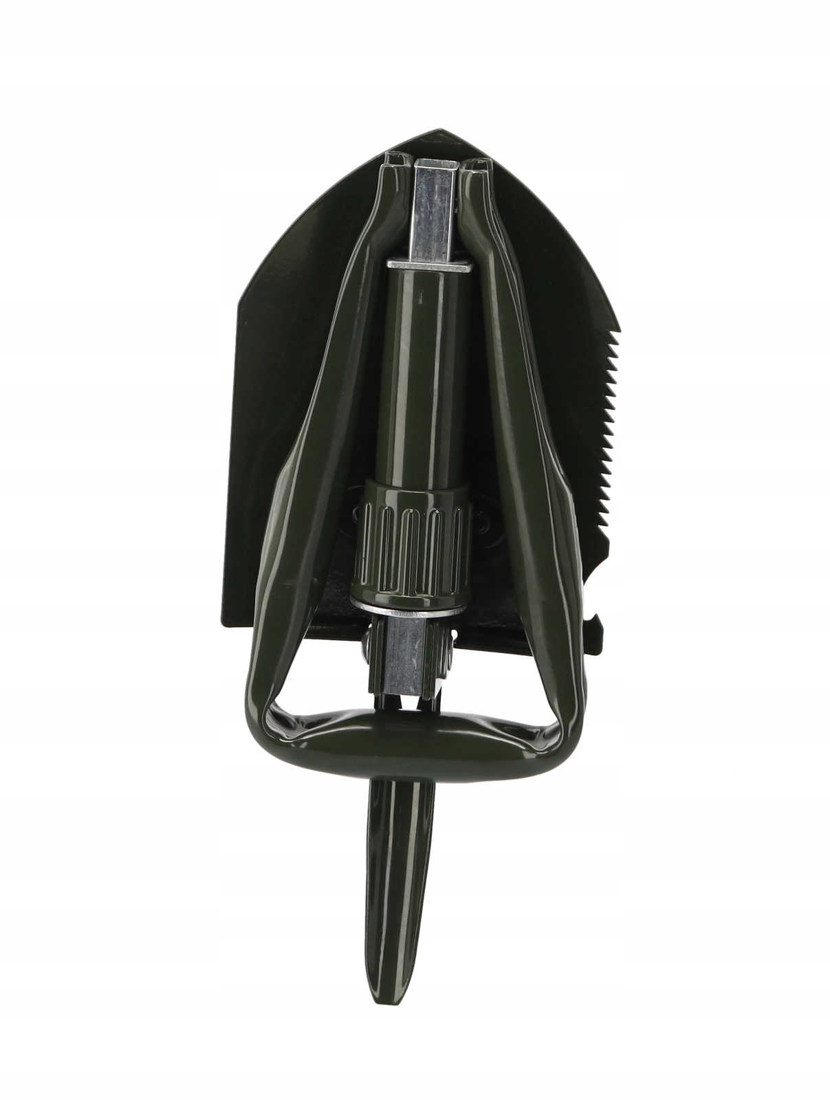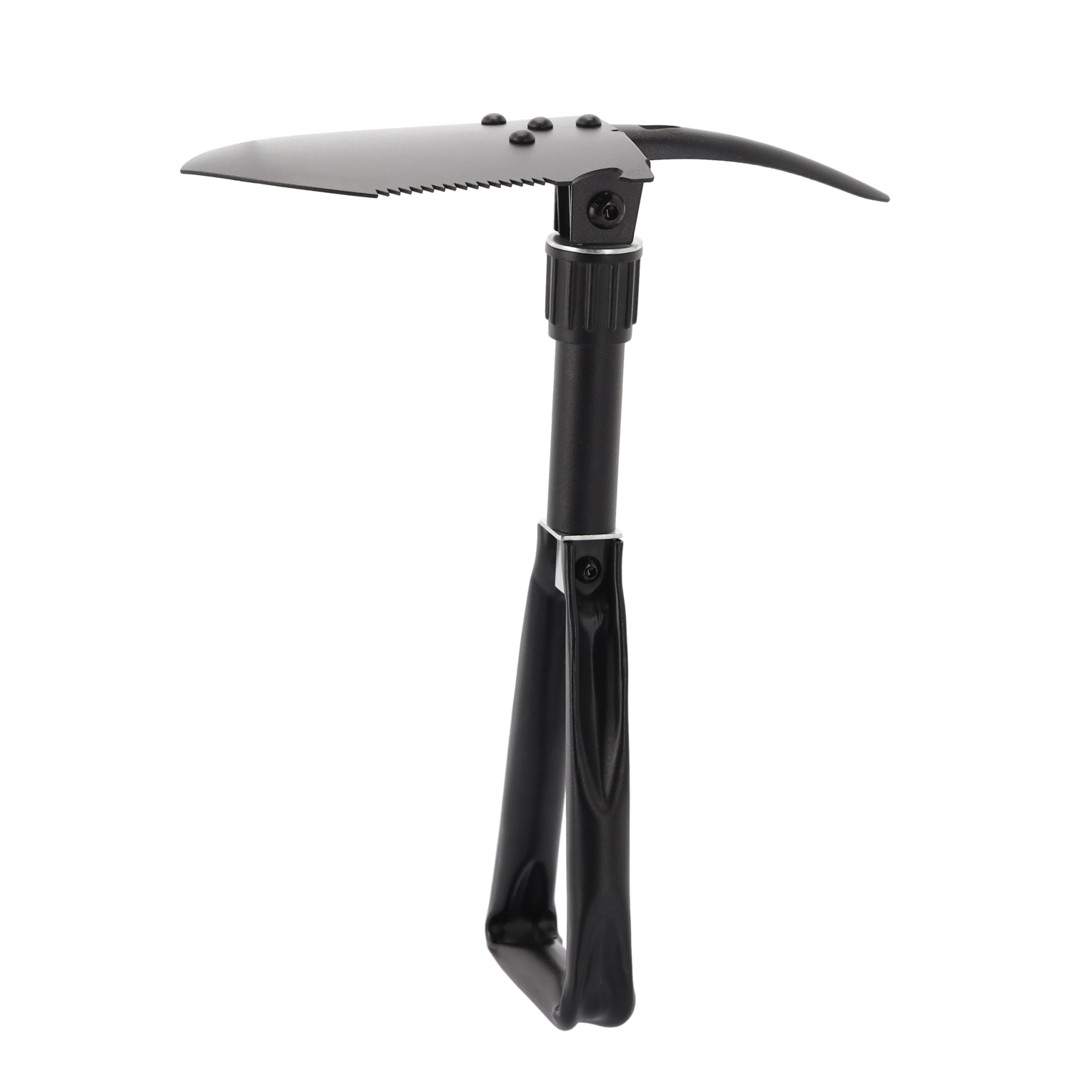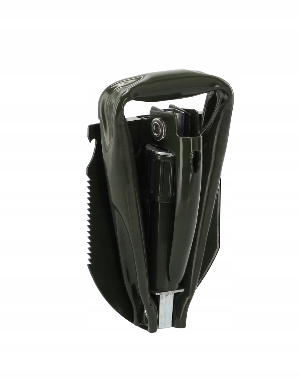 Deze duurzame opvouwbare schep combineert schop, hak, zaag, houweel, zeskantsleutel en flesopener in één gereedschap. Hij kan graven, harde grond losmaken, wortels en takken zagen en kleine outdoorwerkzaamheden aan. Het stalen blad van mangaanstaal met zaagtandrand en het vergrendelbare scharnier zorgen voor stabiliteit onder belasting.