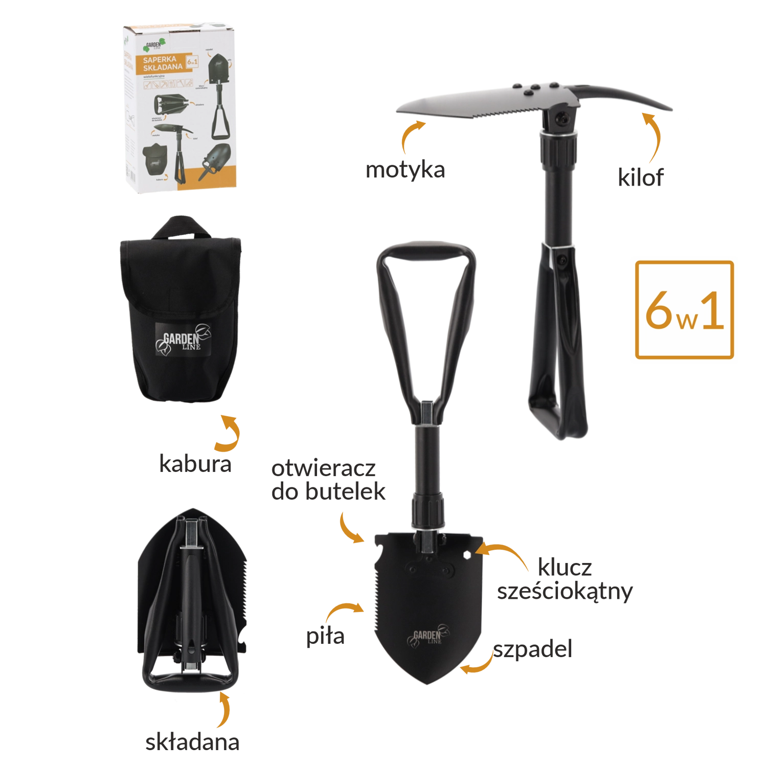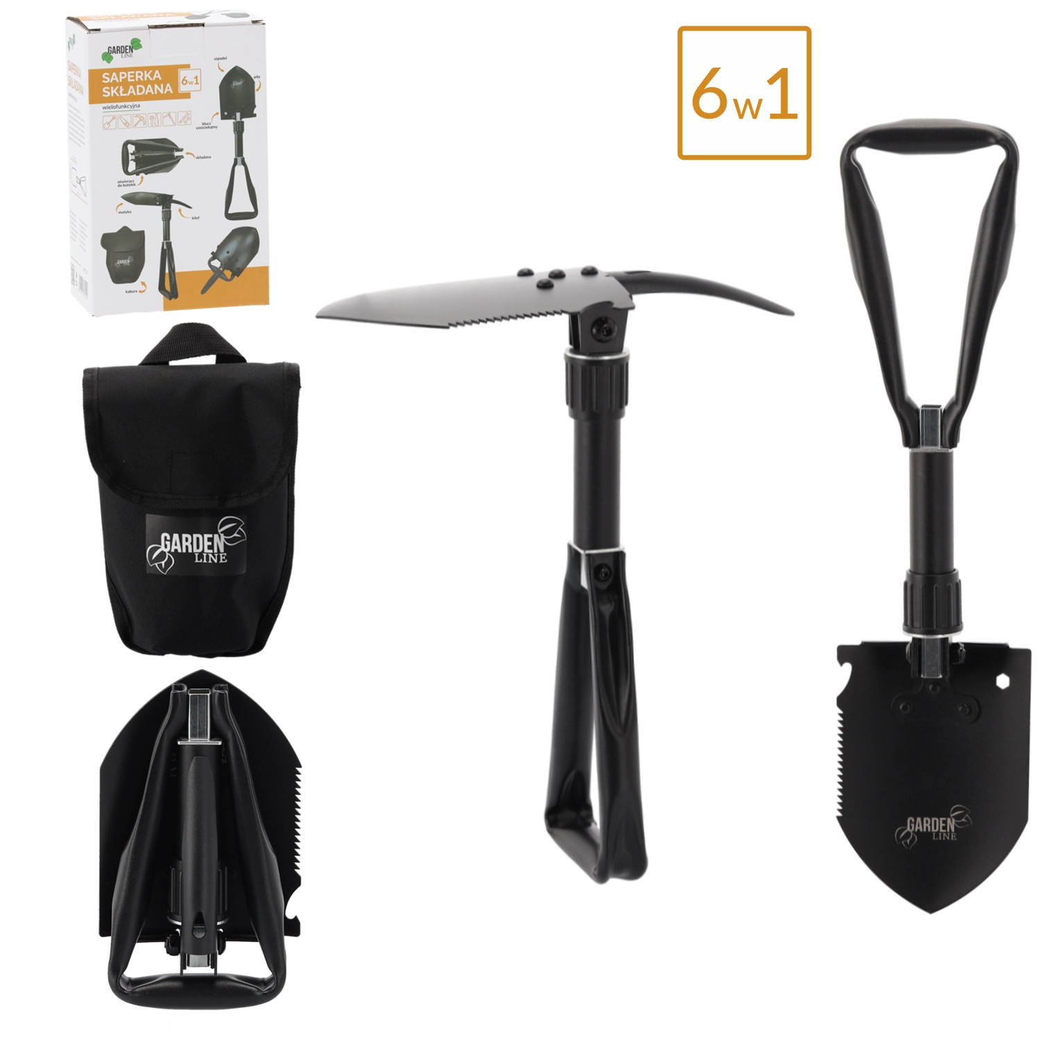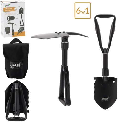 Schop, hak, zaag, houweel, zeskantsleutel en flesopener – universele uitrusting voor kamperen, survival en tuinwerk.