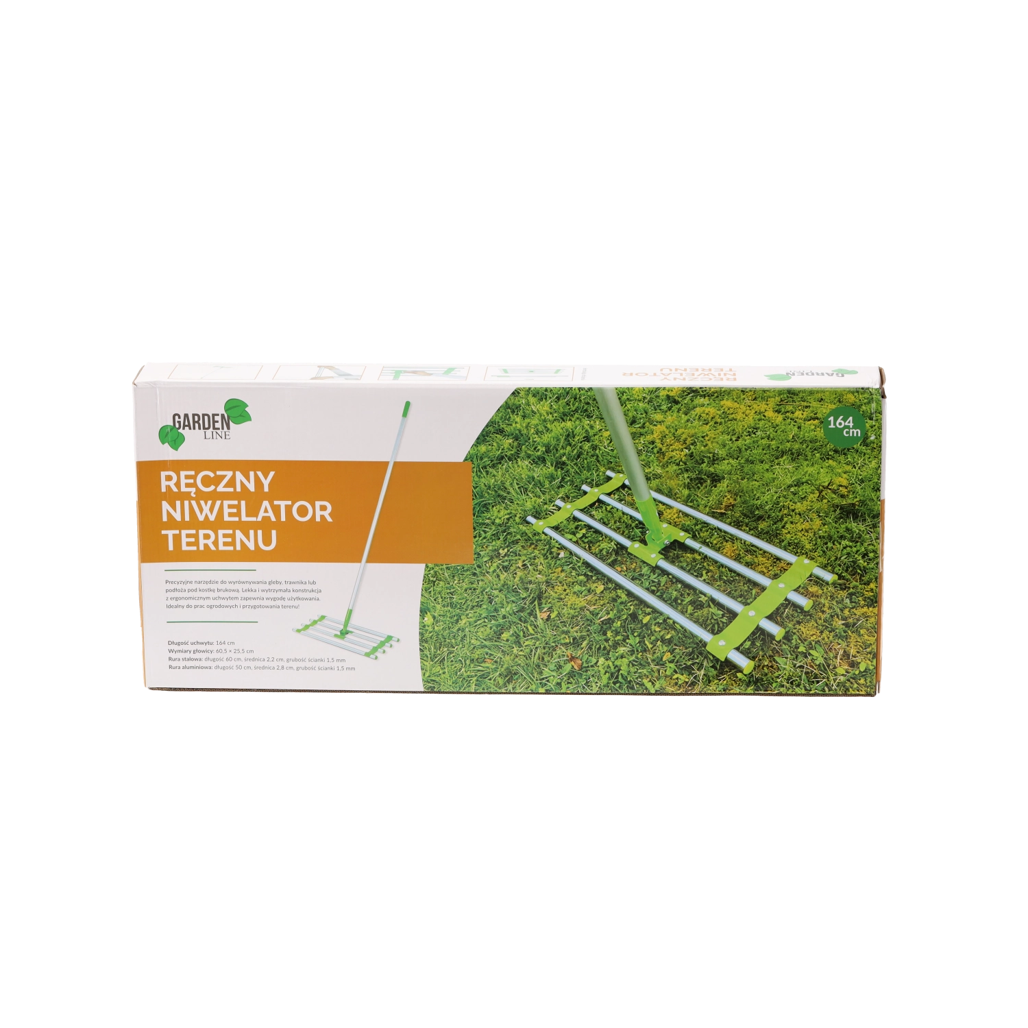 Praktische handmatige terreinnivelleerder van 164 cm voor snel en nauwkeurig egaliseren van aarde, grind of zand. Biedt een robuuste stalen en aluminium constructie, een brede kop voor gelijkmatig trekken en comfortabele handling, ook bij langdurig gebruik.