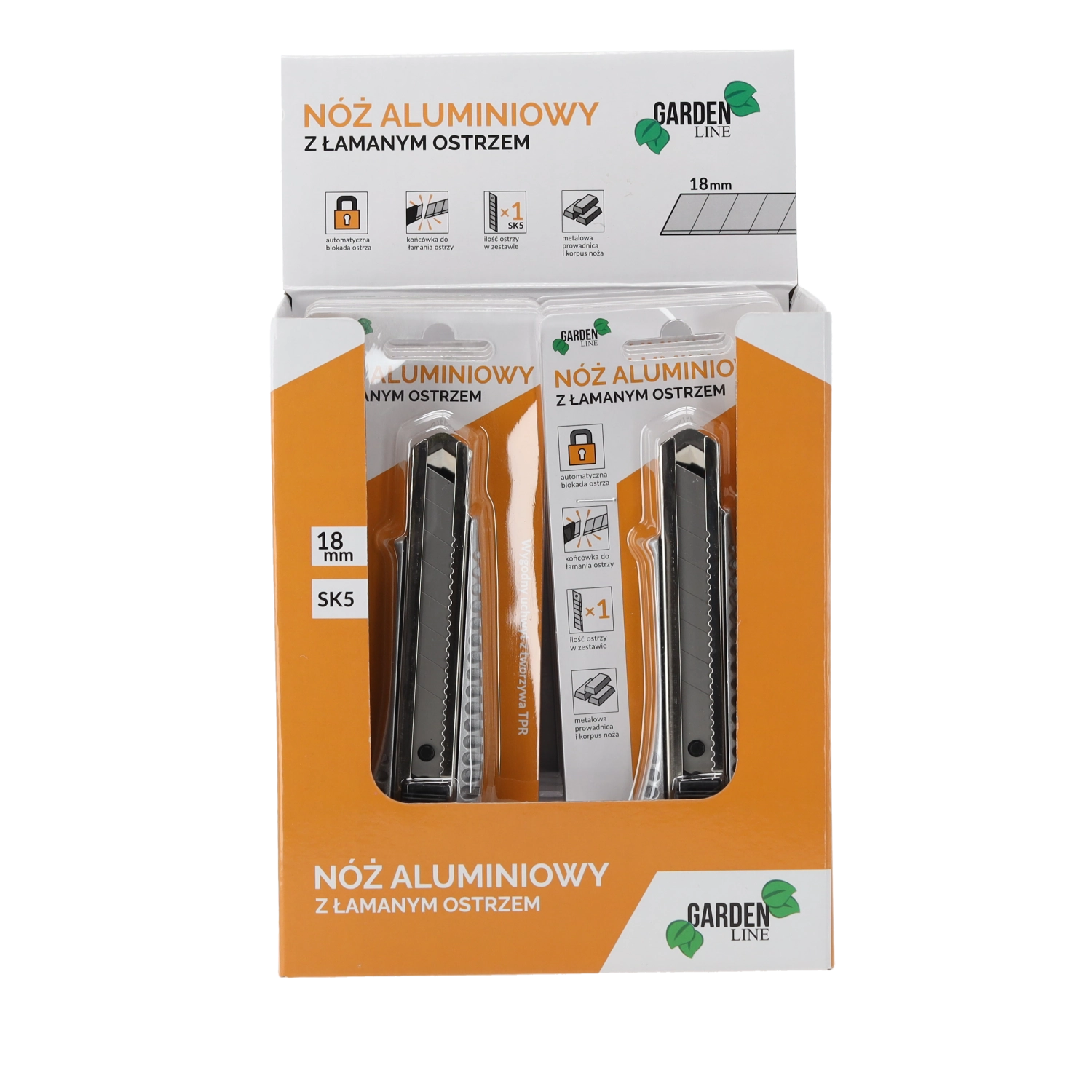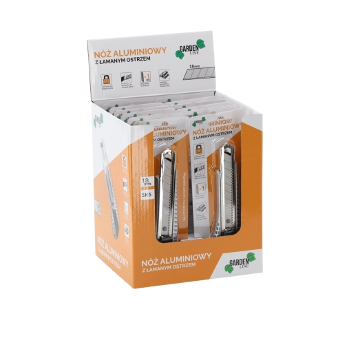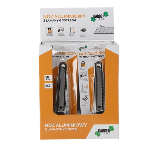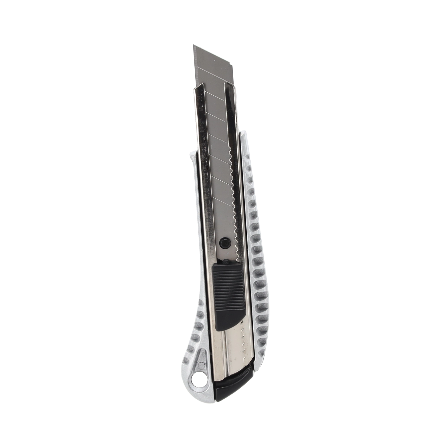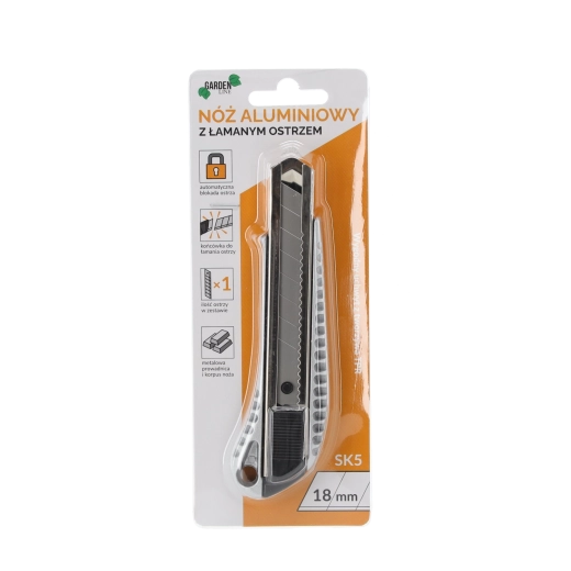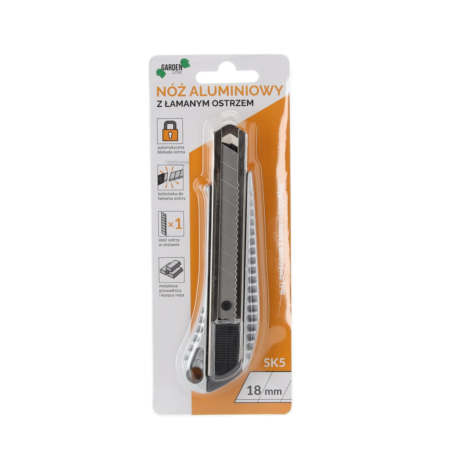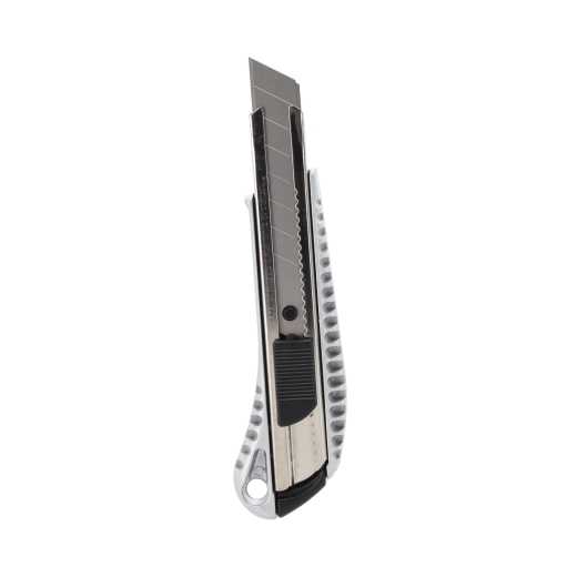 Praktisch en duurzaam afbreekmes 18 mm met een aluminium behuizing en een comfortabele TPR-greep voor veilig en precies snijden. Voorzien van automatische bladblokkering en uitgerust met een scherp lemmet van SK5-staal voor een lange levensduur.