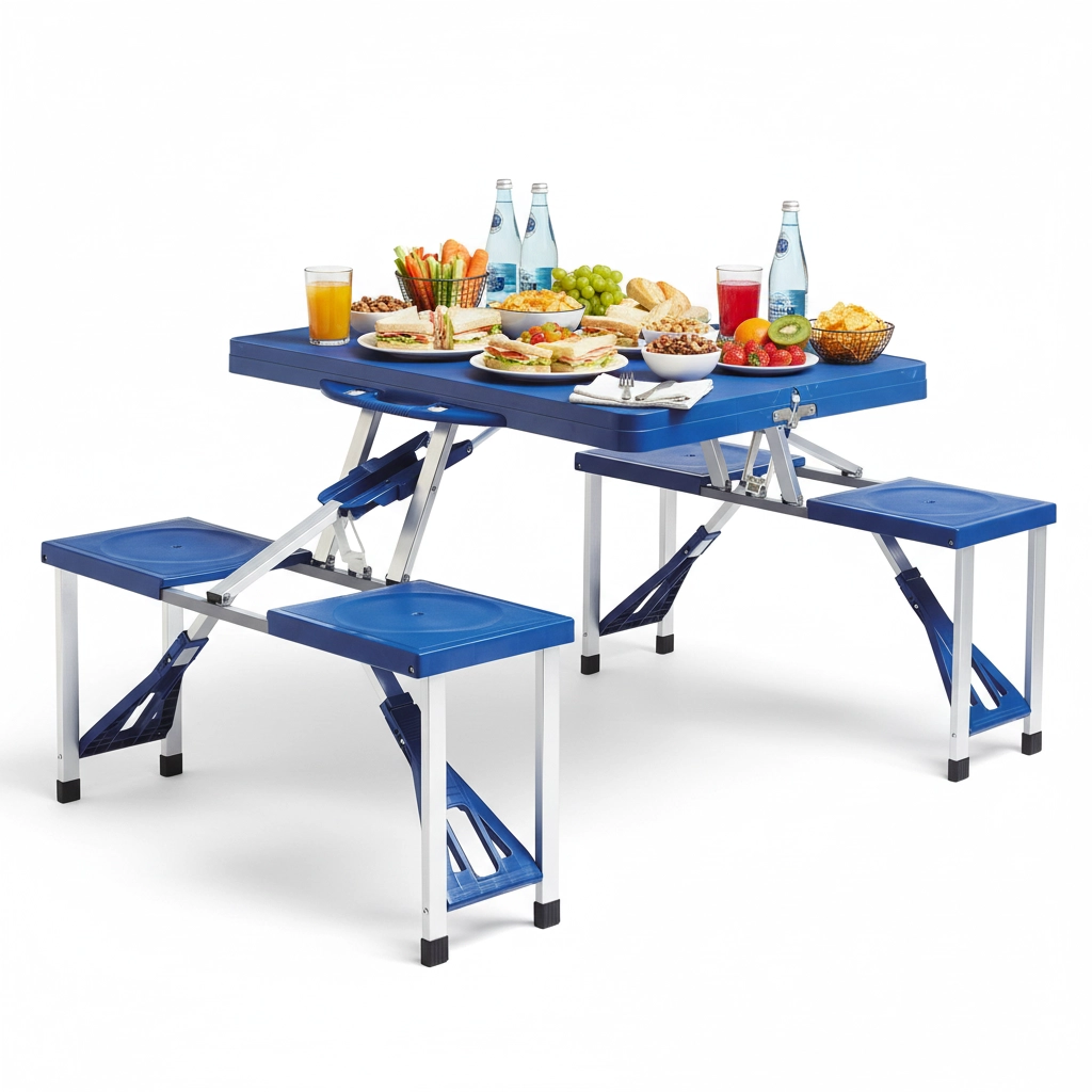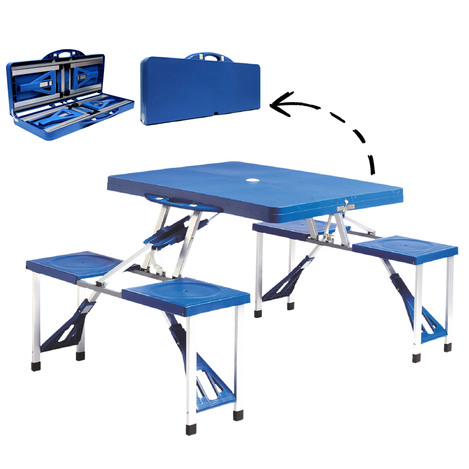 Praktische en lichte opvouwbare picknicktafel met vier geïntegreerde zitplaatsen in het blauw, ideaal voor picknick, kamperen, tuin en aan het meer. Je klapt hem in enkele seconden uit, draagt tot 150 kg en dankzij de parasolopening geniet je van aangename schaduw op warme dagen.