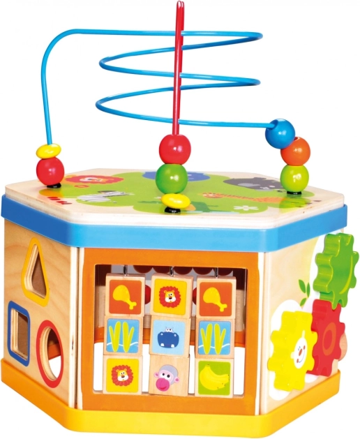 De veelzijdige motorische speelkubus boeit nieuwsgierige kinderen met heldere kleuren en tal van activiteiten met een didactische insteek. Je kunt kralen door een doolhof leiden, kralen tellen, dierenpictogrammen schuiven, ze draaien en voedsel aan hen toewijzen, tandwielen draaien, blokken inwerpen en leren de tijd herkennen. Het speelgoed is robuust en gemaakt van dik multiplex. Belangrijkste kenmerken: kubus met deksel en 3 inzetstukken; ontwikkel oriëntatie in ruimte en tijd; vorm- en kleurtoewijzing; oefen de fijne motoriek; robuuste houten uitvoering