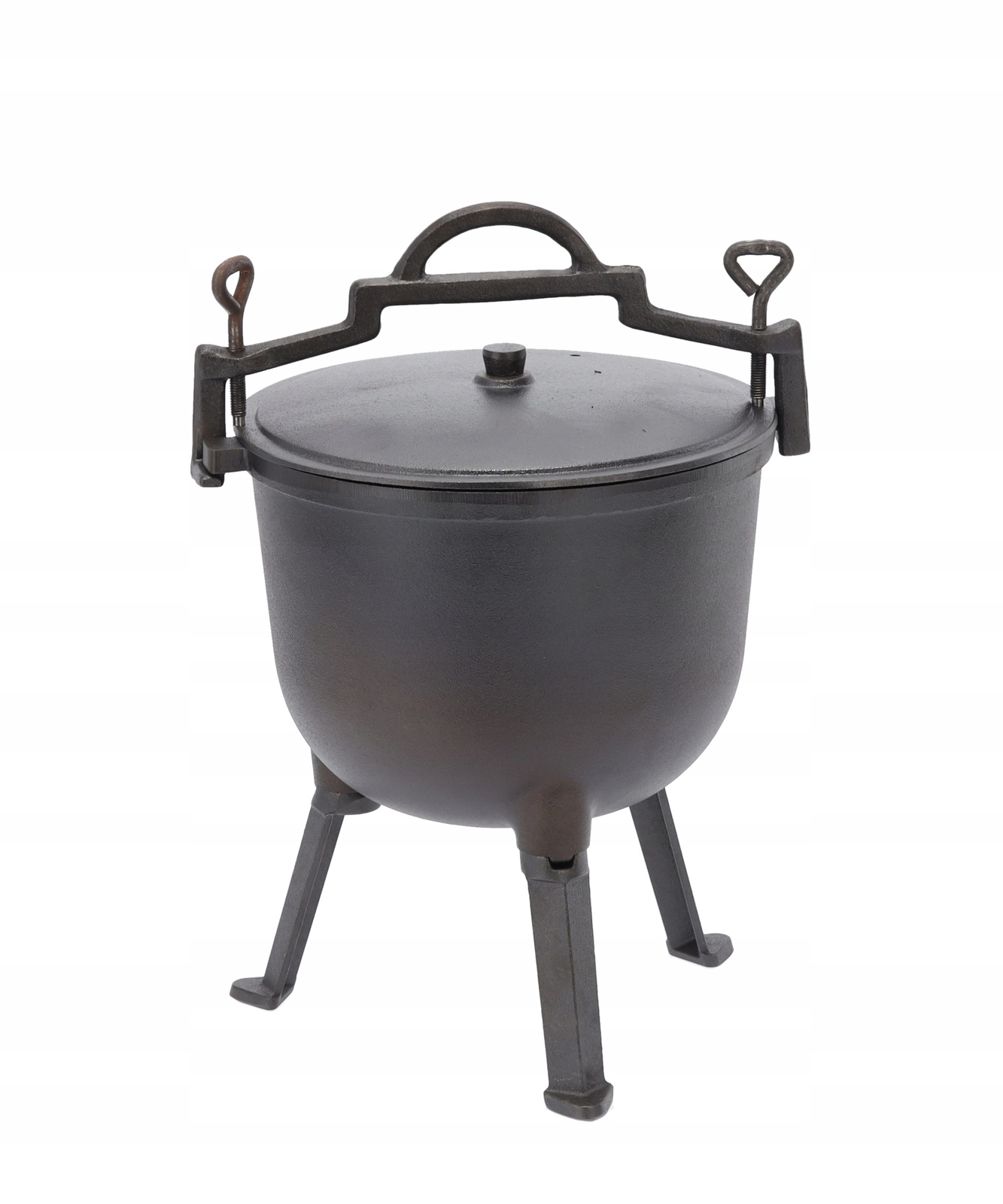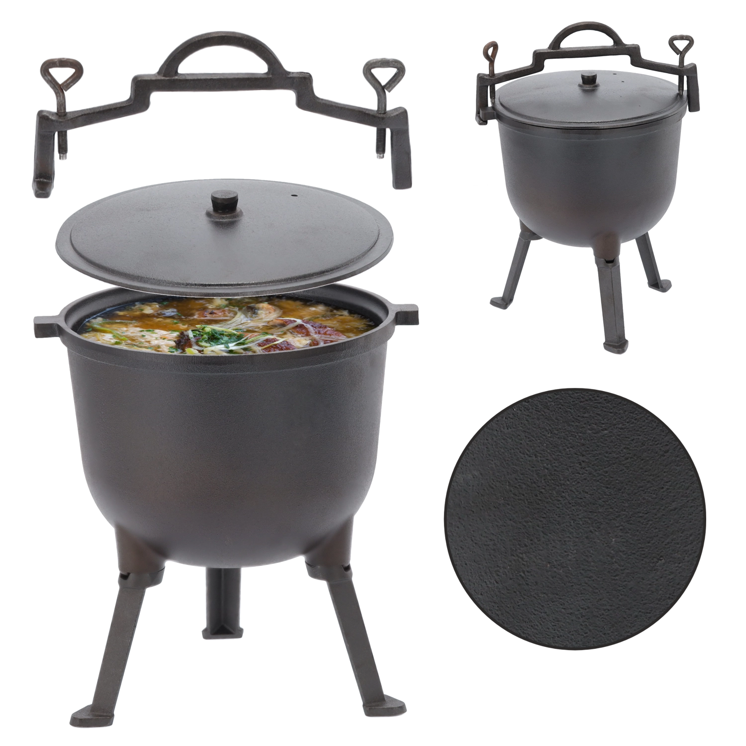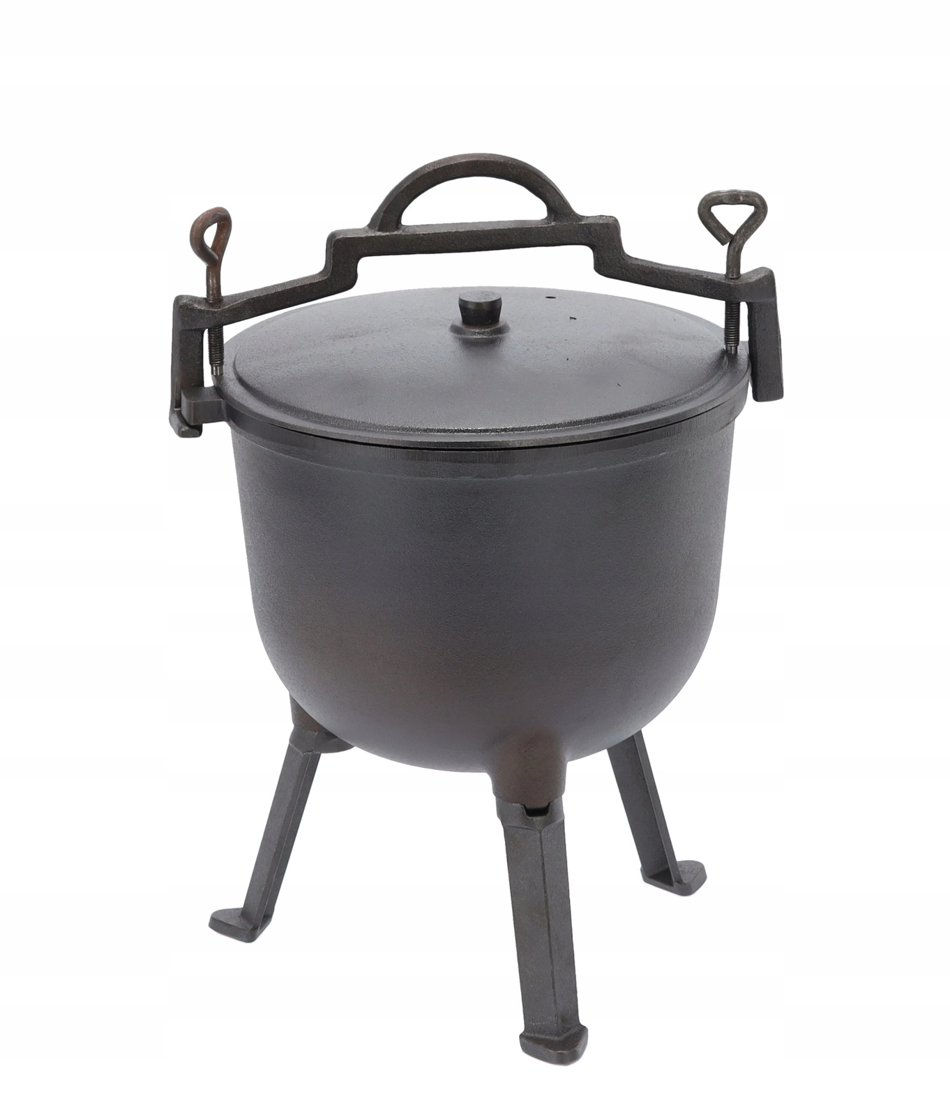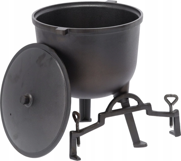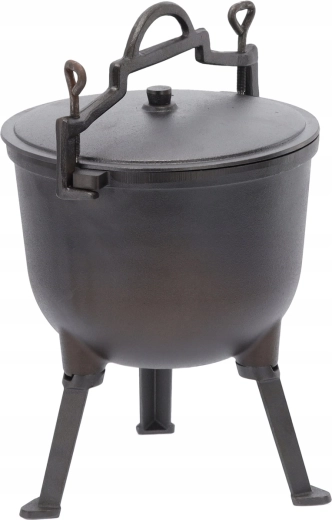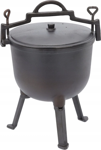 Deze grote gietijzeren ketel is gemaakt voor goulash, soepen en langzaam stoven boven open vuur. De stevige constructie kan hoge temperaturen en wisselende buitenomstandigheden aan, terwijl het deksel vocht en smaak binnenhoudt. Dankzij de handgreep is de ketel gemakkelijk te dragen en boven het vuur op te hangen.