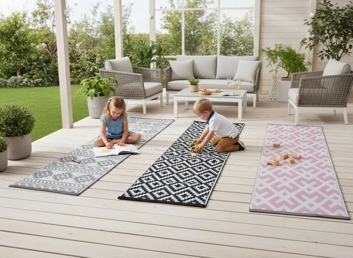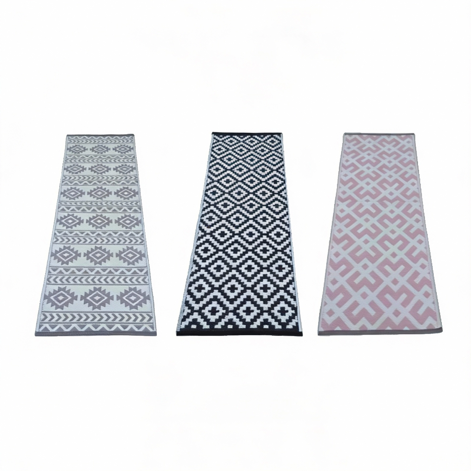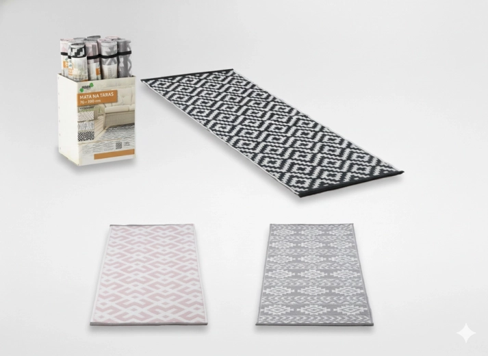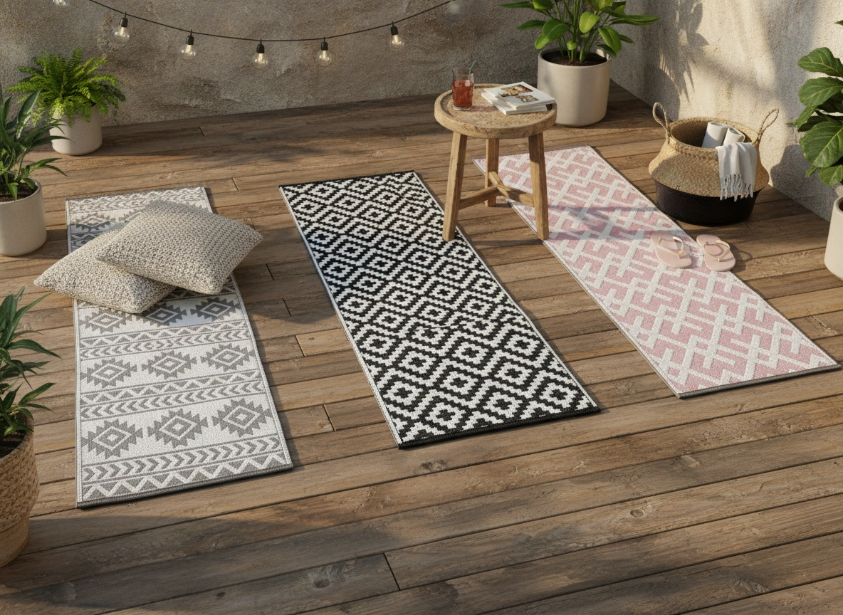 Een stijlvolle buitenloper van 70 × 180 cm tovert je balkon of terras in een handomdraai om. Dankzij duurzaam polypropyleen is hij gemakkelijk te reinigen, weerbestendig en biedt hij moderne geometrische patronen die de ruimte een frisse uitstraling geven.