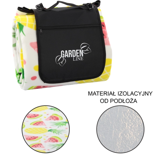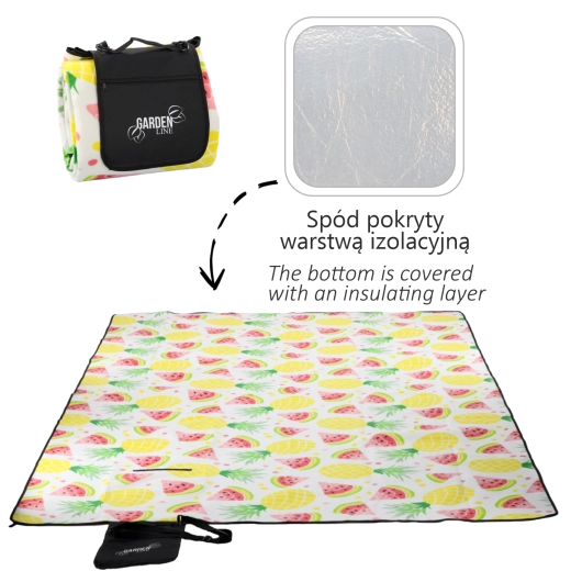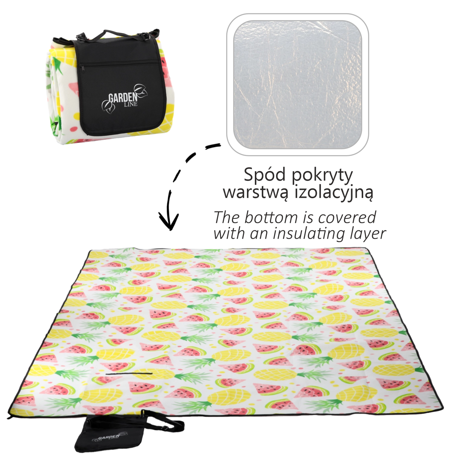 Dit stijlvolle picknickkleed met fruitmotief is ideaal voor parken, tuinen en het strand. De aluminium/isolatielaag aan de onderkant houdt vocht en kou betrouwbaar tegen, terwijl de zachte schuimvulling extra comfort biedt bij zitten of liggen. De bovenste textiellaag voelt prettig aan en is tegelijk duurzaam voor dagelijks gebruik.