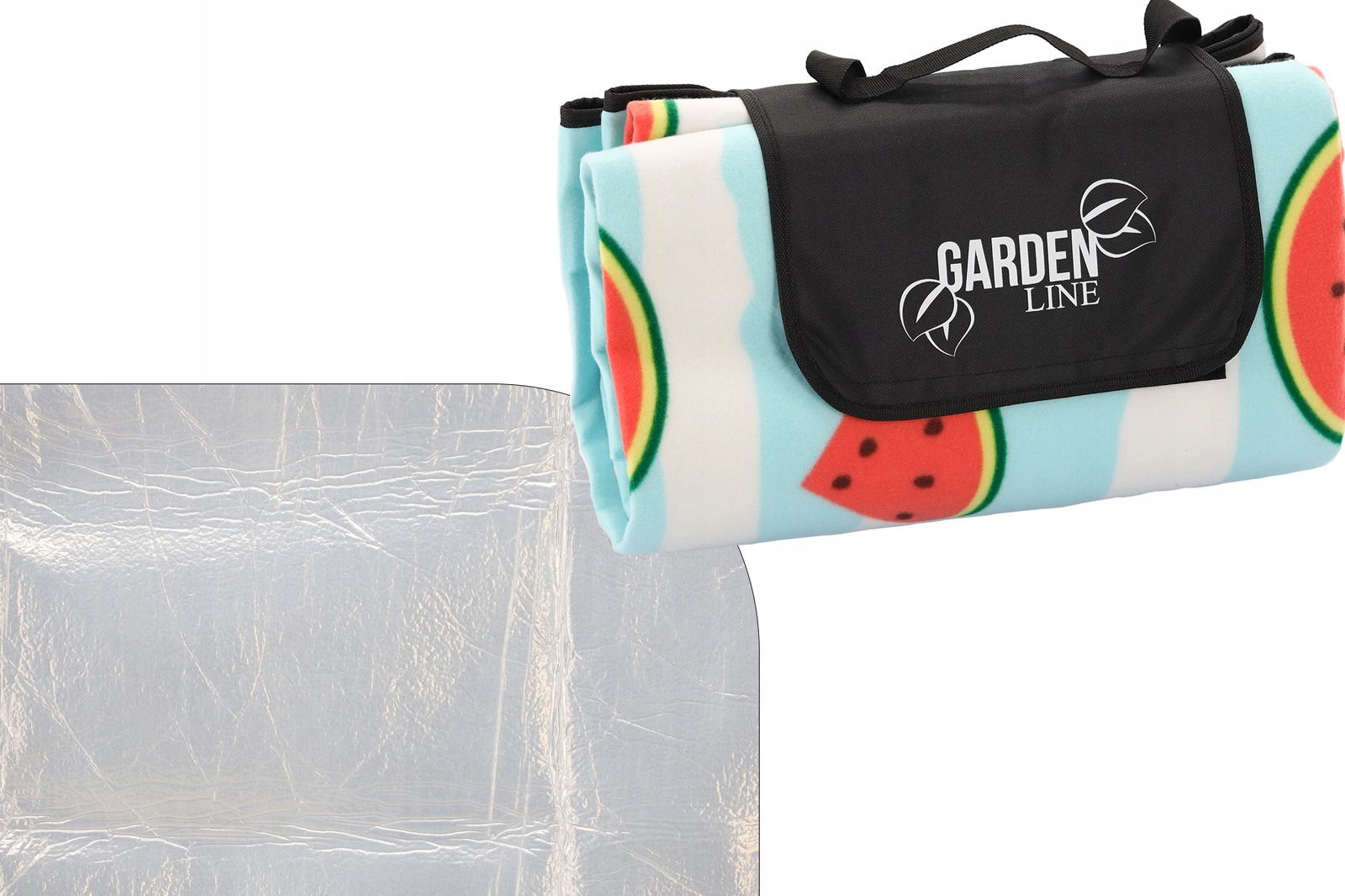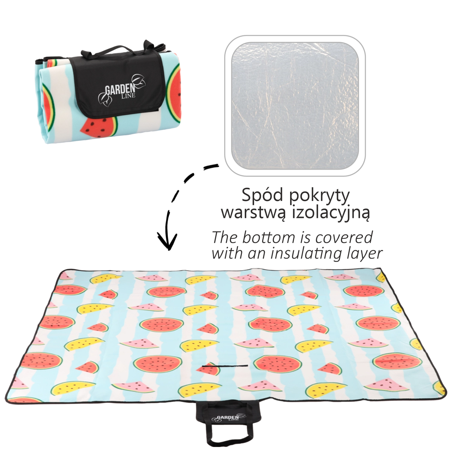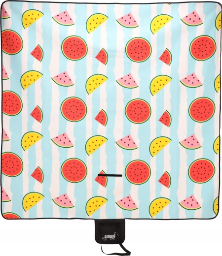 Geniet overal van een picknick met dit praktische en stijlvolle kleed van 200 × 200 cm. Dankzij de drielaagse constructie biedt het een zachte en comfortabele bovenlaag, isolerend schuim voor extra comfort en een waterdichte onderlaag tegen vocht. Het vrolijke fruitige design met watermeloenen en het eenvoudige opvouwen met een geïntegreerd draaghengsel maken het ideaal voor picknick, strand en kamperen.