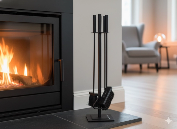 - Complete uitrusting voor het bedienen van de haard: schep, handveger en pook.