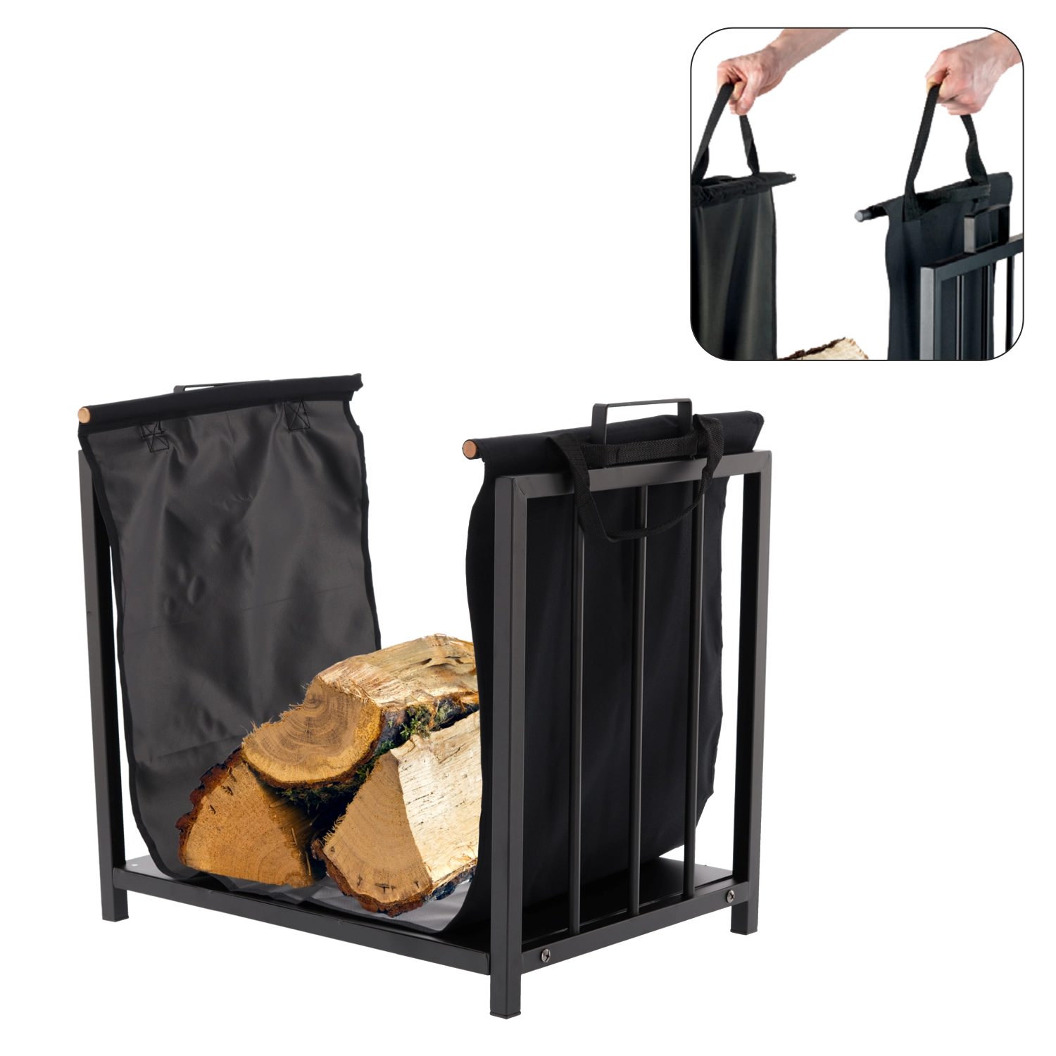 De textiele inzet met handgrepen maakt het comfortabel om houtblokken van buiten naar binnen te dragen en houdt de omgeving van de haard vrij van splinters en stof.