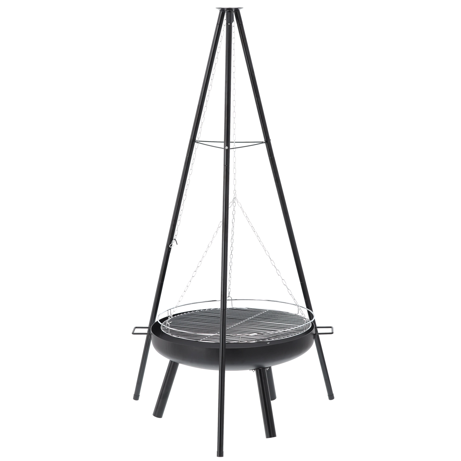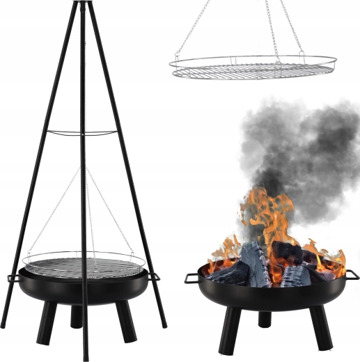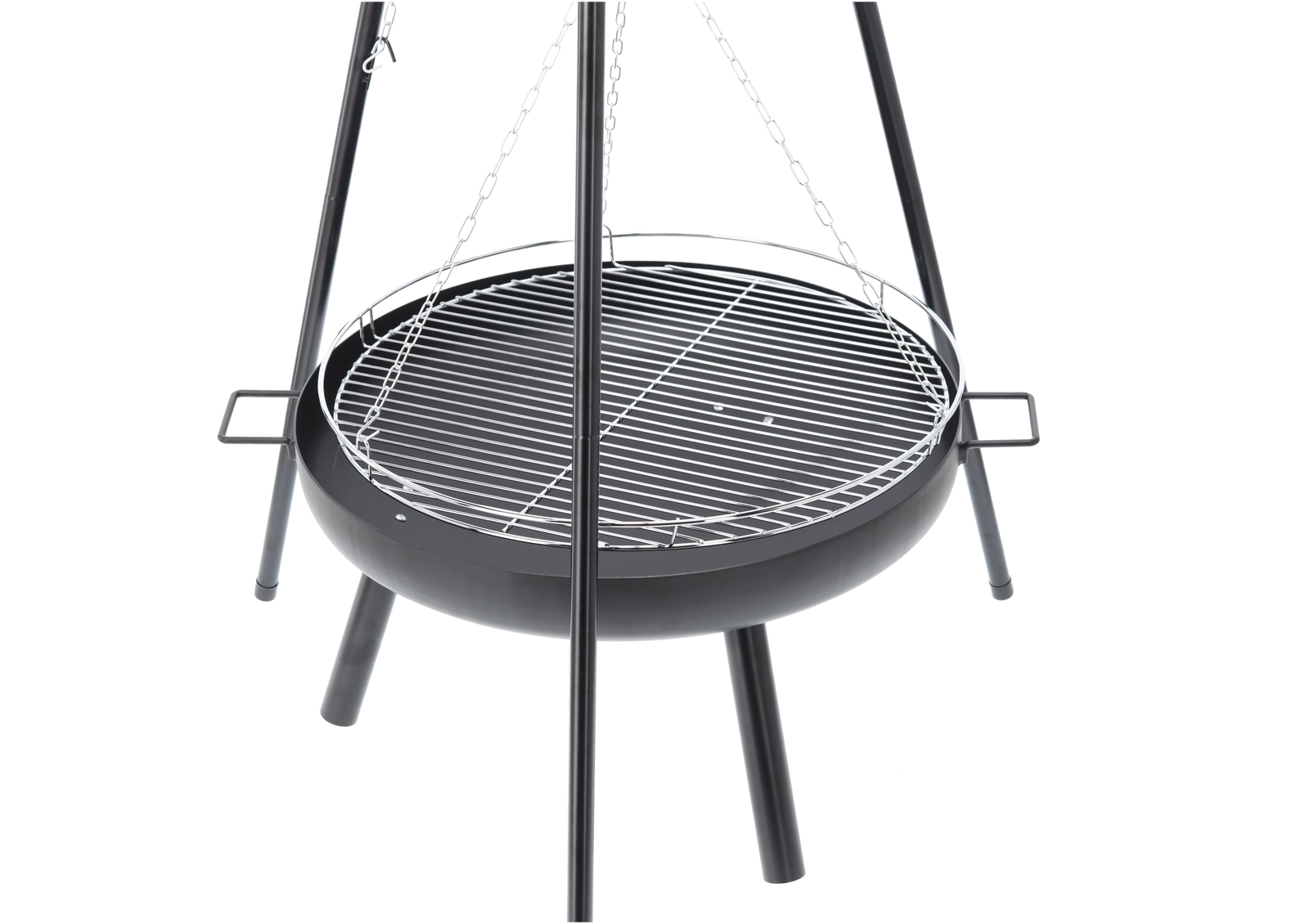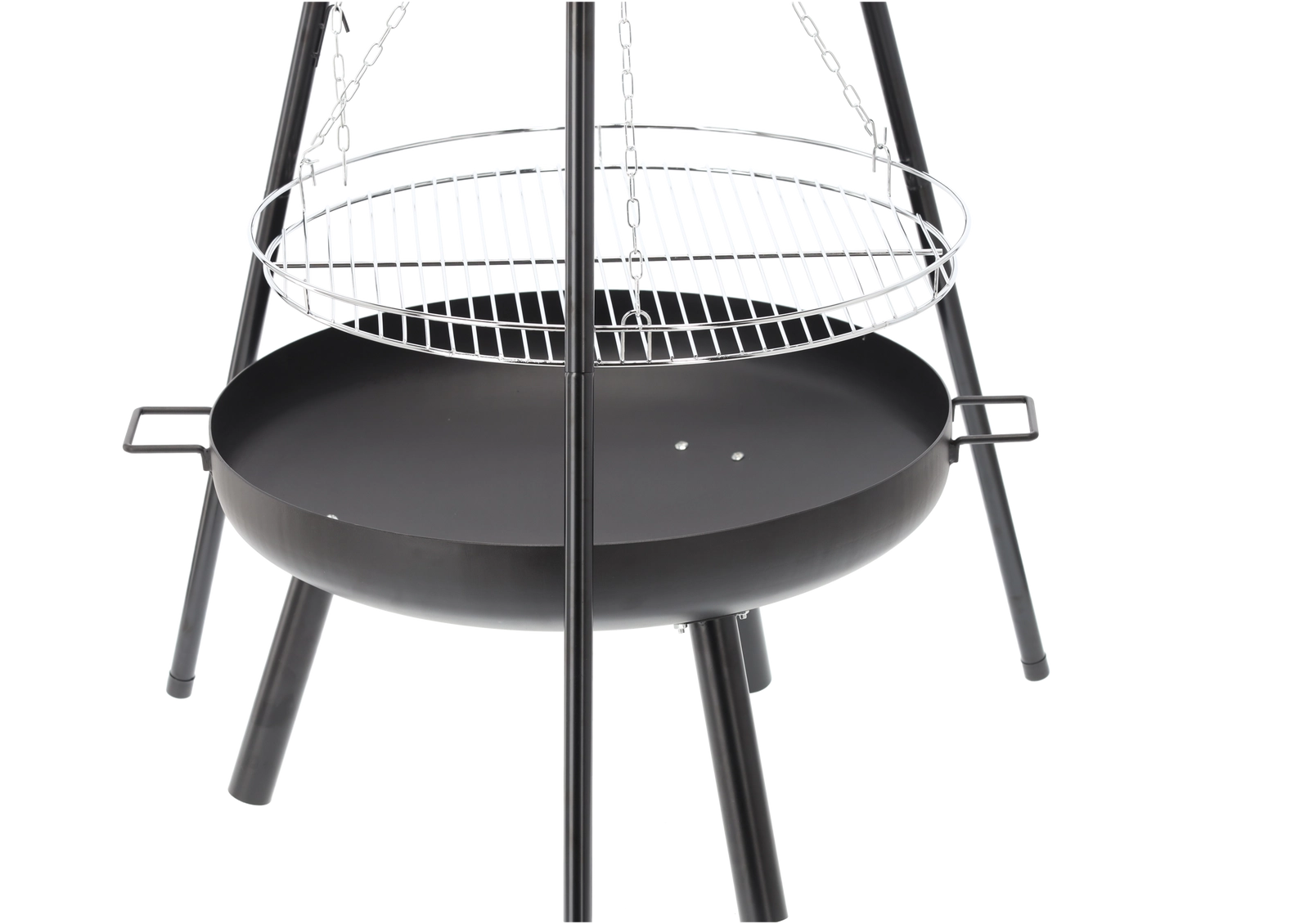 Stijlvolle 2-in-1-oplossing: vuurschaal en hangende grill. De robuuste stalen schaal met een dikte van 2 mm en een hittebestendige zwarte coating staat garant voor een lange levensduur, ook bij veelvuldig gebruik. Dankzij het hangende rooster aan kettingen stel je eenvoudig de afstand tot de hitte in en bereid je sappig vlees, groente en spiesen precies naar smaak.