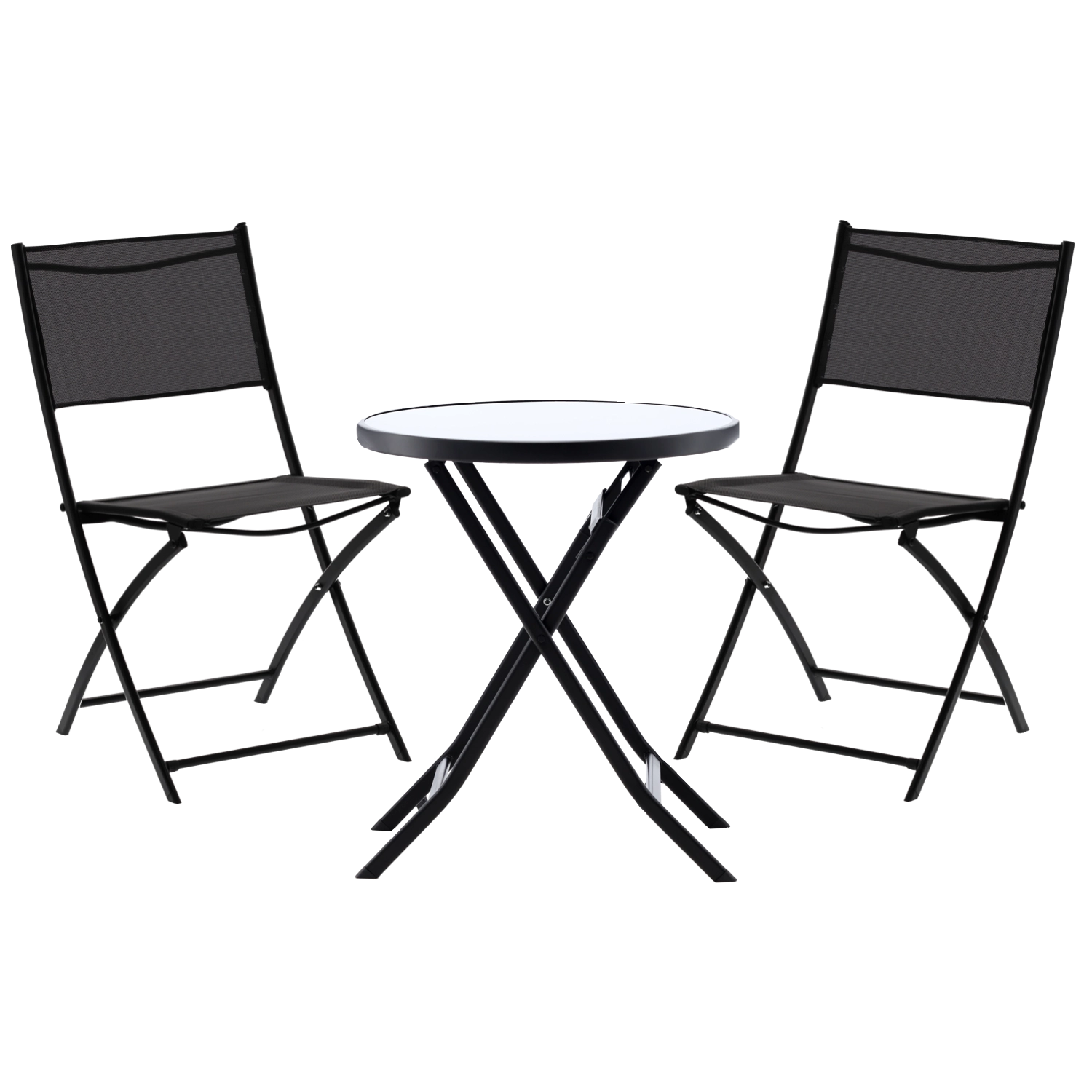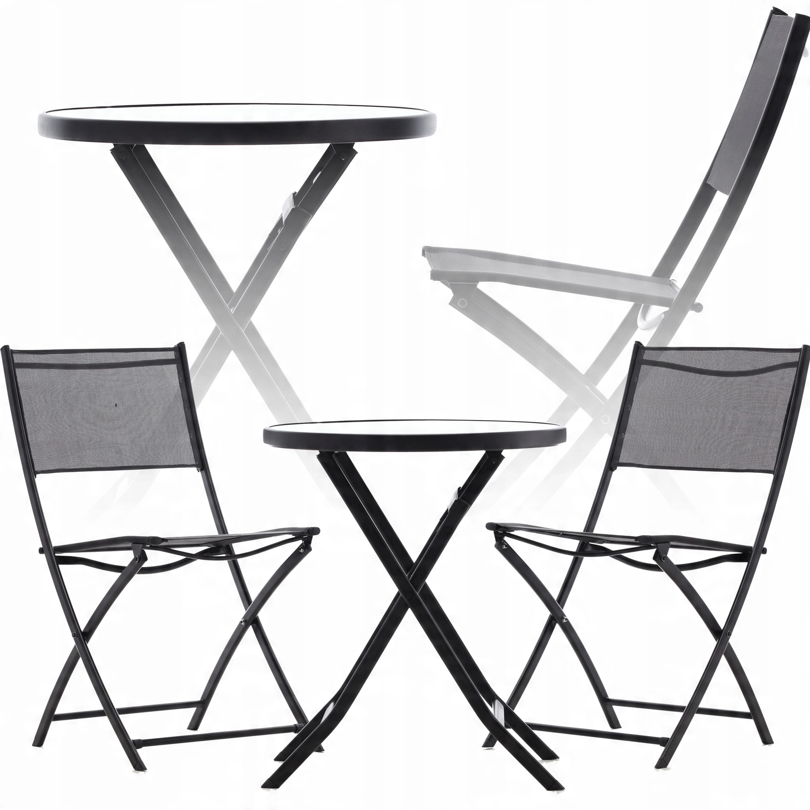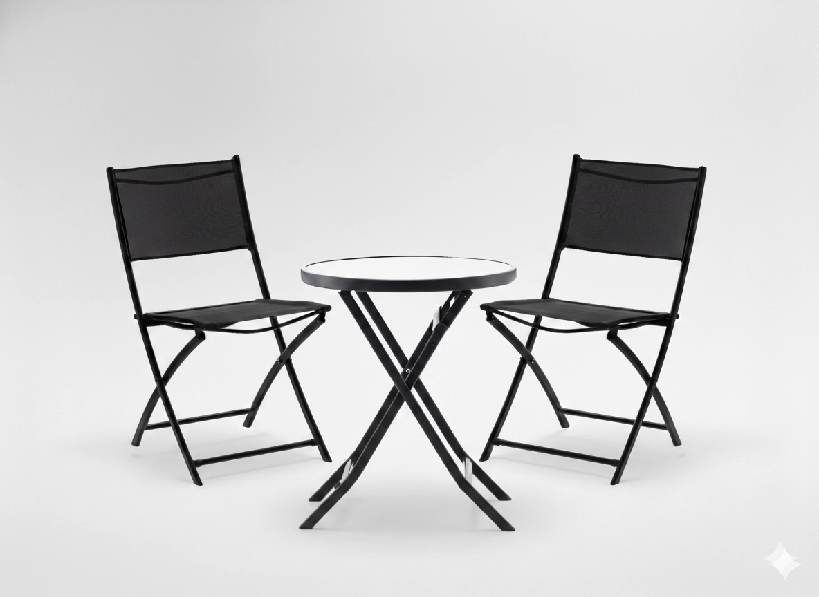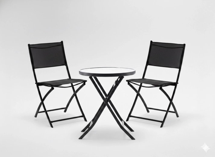 Elegante en praktische bistroset voor het balkon met een inklapbare ronde tafel en twee stoelen in het zwart. Ideaal voor balkons en kleine terrassen – dankzij de inklapbare constructie bespaar je ruimte, terwijl het duurzame metalen frame en het geharde glas zorgen voor een lange levensduur en eenvoudig onderhoud. De stoelen met ademende textilene bieden comfort, zowel buiten als binnen.